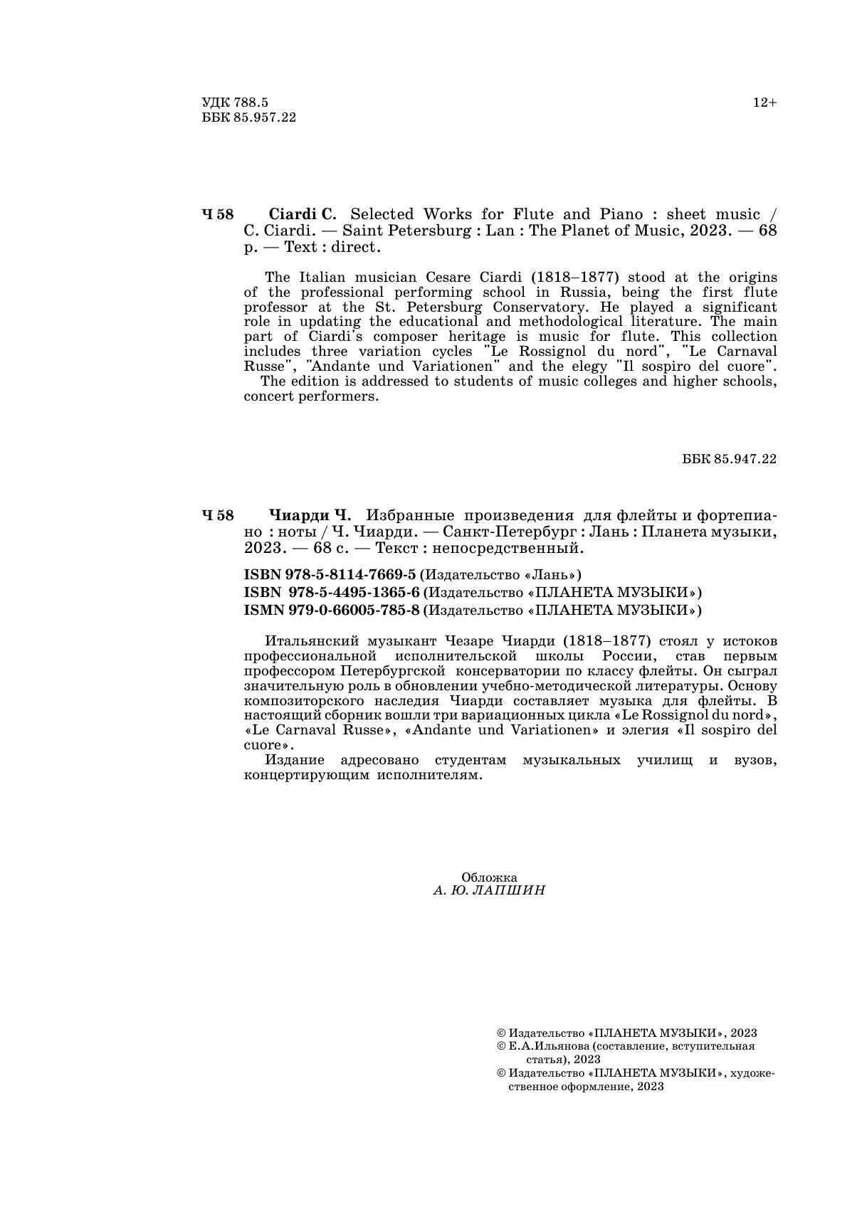 Итальянский музыкант Чезаре Чиарди (1818-1877) стоял у истоков профессиональной исполнительской школы России, став первым профессором Петербургской консерватории по классу флейты. Он сыграл значительную роль в обновлении учебно-методической литературы. Основу композиторского наследия Чиарди составляет музыка для флейты. В настоящий сборник вошли три вариационных цикла «Le Rossignol du nord», «Le Carnaval Russe», «Andante und Variationen» и элегия «Il sospiro del cuore». Издание адресовано студентам музыкальных училищ и ВУЗов, концертирующим исполнителям.