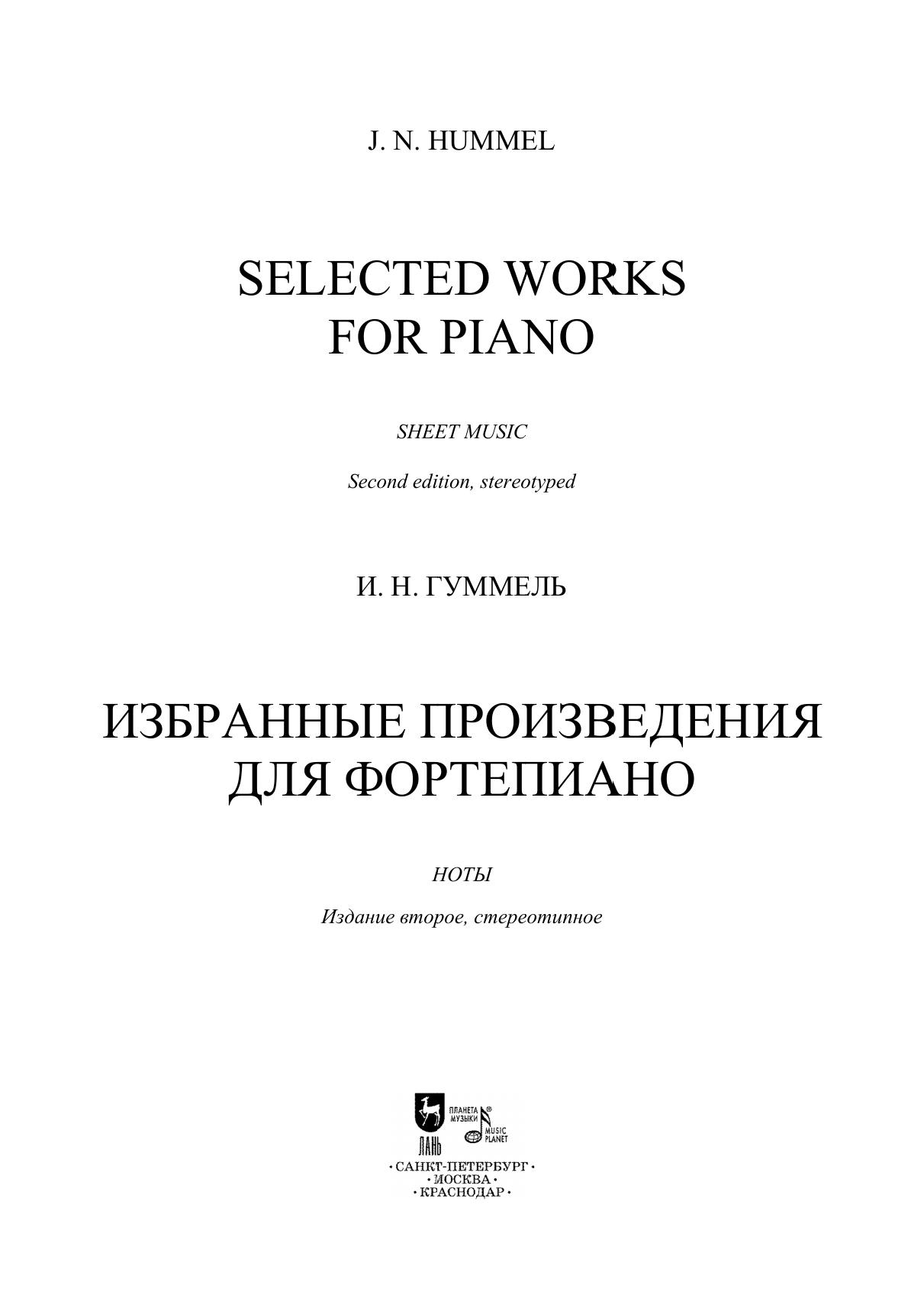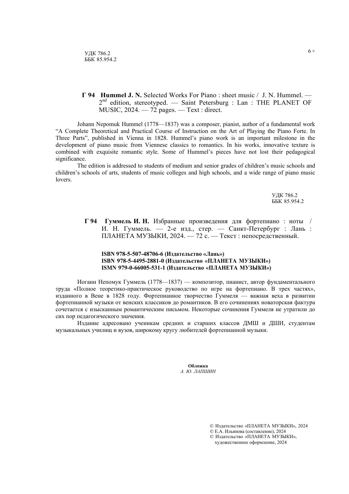 Иоганн Непомук Гуммель (1778—1837) — композитор, пианист, автор фундаментального труда "Полное теоретико-практическое руководство по игре на фортепиано. В трех частях", изданного в Вене в 1828 году. Фортепианное творчество Гуммеля — важная веха в развитии фортепианной музыки от венских классиков до романтиков. В его сочинениях новаторская фактура сочетается с изысканным романтическим письмом. Некоторые сочинения Гуммеля не утратили до сих пор педагогического значения. Издание адресовано ученикам средних и старших классов ДМШ и ДШИ, студентам музыкальных училищ и вузов, широкому кругу любителей фортепианной музыки. Johann Nepomuk Hummel (1778—1837) was a composer, pianist, author of a fundamental work “A Complete Theoretical and Practical Course of Instruction on the Art of Playing the Piano Forte. In Three Parts”, published in Vienna in 1828. Hummel's piano work is an important milestone in the development of piano music from Viennese classics to romantics. In his works, innovative texture is combined with exquisite romantic style. Some of Hummel’s pieces have not lost their pedagogical significance. The edition is addressed to students of medium and senior grades of children’s music schools and children’s schools of arts, students of music colleges and high schools, and a wide range of piano music lovers.