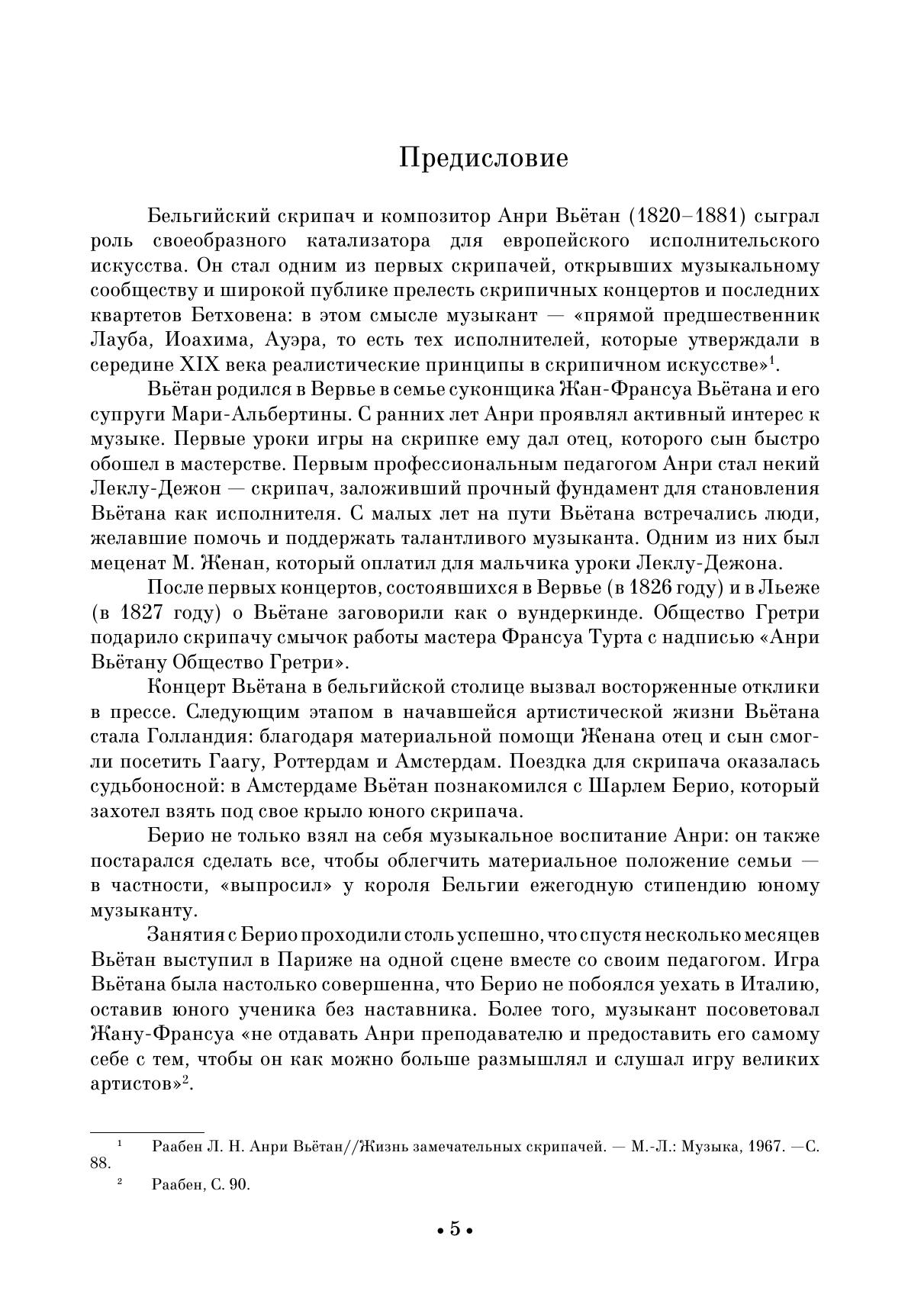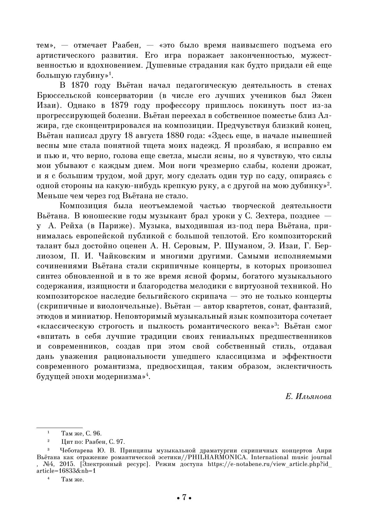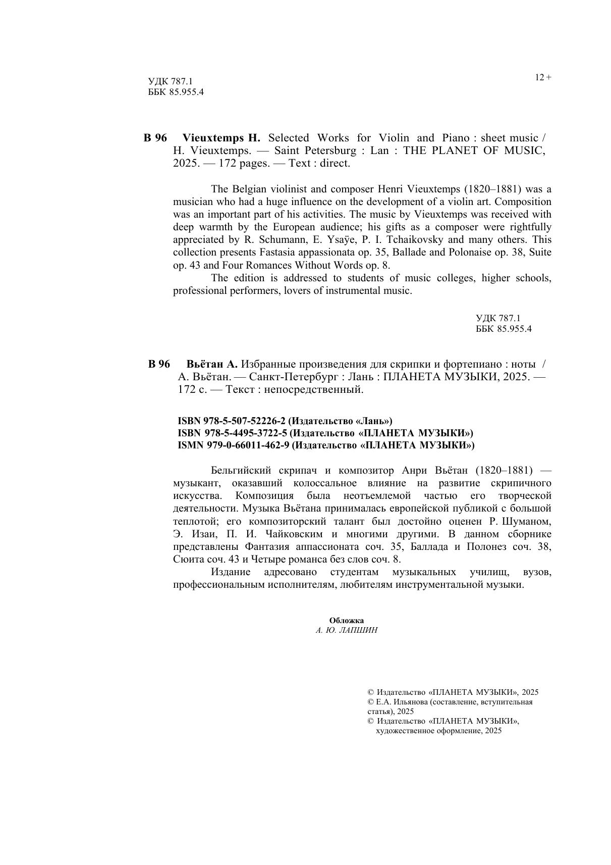 Бельгийский скрипач и композитор Анри Вьётан (1820–1881) — музыкант, оказавший колоссальное влияние на развитие скрипичного искусства. Композиция была неотъемлемой частью его творческой деятельности. Музыка Вьётана принималась европейской публикой с большой теплотой, его композиторский талант был достойно оценен Р. Шуманом, Э. Изаи, П. И. Чайковским и многими другими. В данном сборнике представлены Фантазия аппассионата соч. 35, Баллада и Полонез соч. 38, Сюита соч. 43 и Четыре романса без слов соч. 8. Издание адресовано студентам музыкальных училищ, вузов, профессиональным исполнителям, любителям инструментальной музыки. The Belgian violinist and composer Henri Vieuxtemps (1820–1881) was a musician who had a huge influence on the development of a violin art. Composition was an important part of his activities. The music by Vieuxtemps was received with deep warmth by the European audience, his gifts as a composer were rightfully appreciated by R. Schumann, E. Ysaÿe, P. I. Tchaikovsky and many others. This collection presents Fastasia appassionata op. 35, Ballade and Polonaise op. 38, Suite op. 43 and Four Romances Without Words op. 8. The edition is addressed to students of music colleges, higher schools, professional performers, lovers of instrumental music.