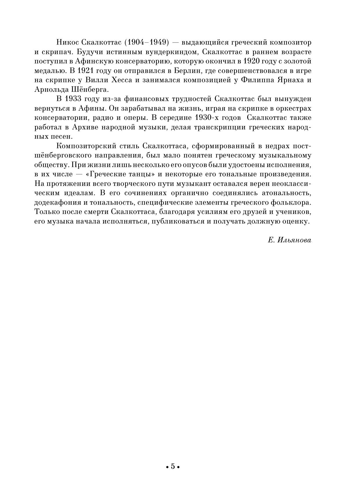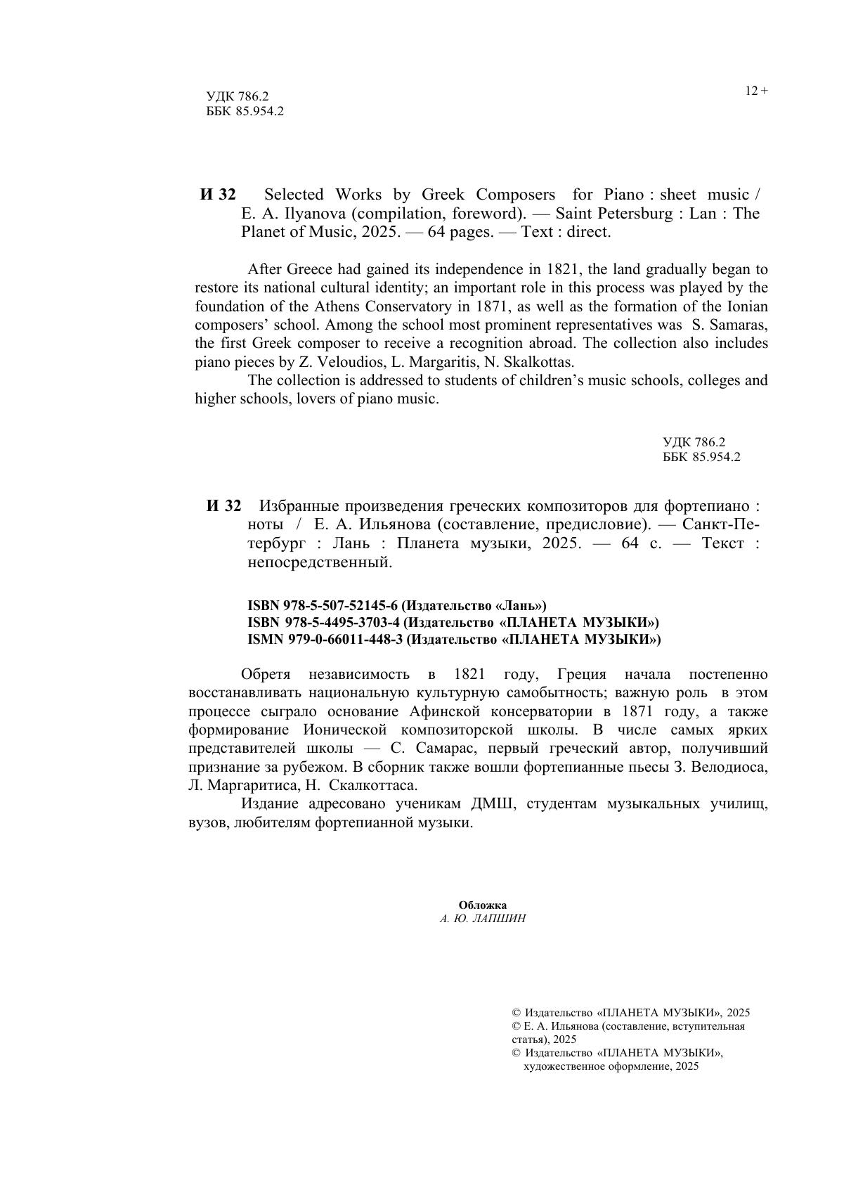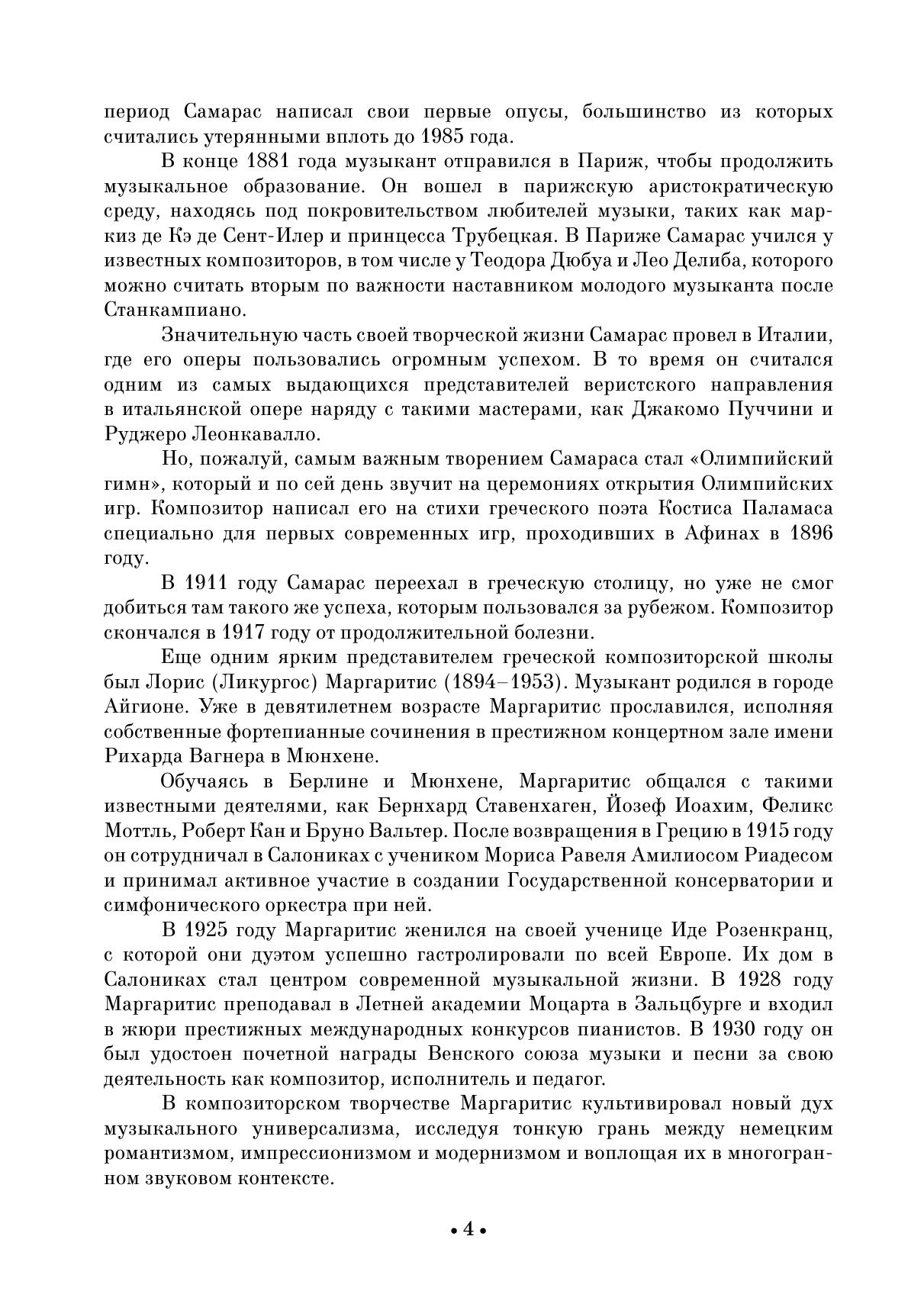 Обретя независимость в 1821 году, Греция начала постепенно восстанавливать национальную культурную самобытность, важную роль в этом процессе сыграло основание Афинской консерватории в 1871 году, а также формирование Ионической композиторской школы. В числе самых ярких представителей школы — С. Самарас, первый греческий автор, получивший признание за рубежом. В сборник также вошли фортепианные пьесы З. Велодиоса, Л. Маргаритиса, Н. Скалкотаса. Издание адресовано ученикам ДМШ, студентам музыкальных училищ, вузов, любителям фортепианной музыки. After Greece had gained its independence in 1821, the land gradually began to restore its national cultural identity, an important role in this process was played by the foundation of the Athens Conservatory in 1871, as well as the formation of the Ionian composers’ school. Among the school most prominent representatives was S. Samaras, the first Greek composer to receive a recognition abroad. The collection also includes piano pieces by Z. Veloudios, L. Margaritis, N. Skalkottas. The collection is addressed to students of children’s music schools, colleges and higher schools, lovers of piano music.