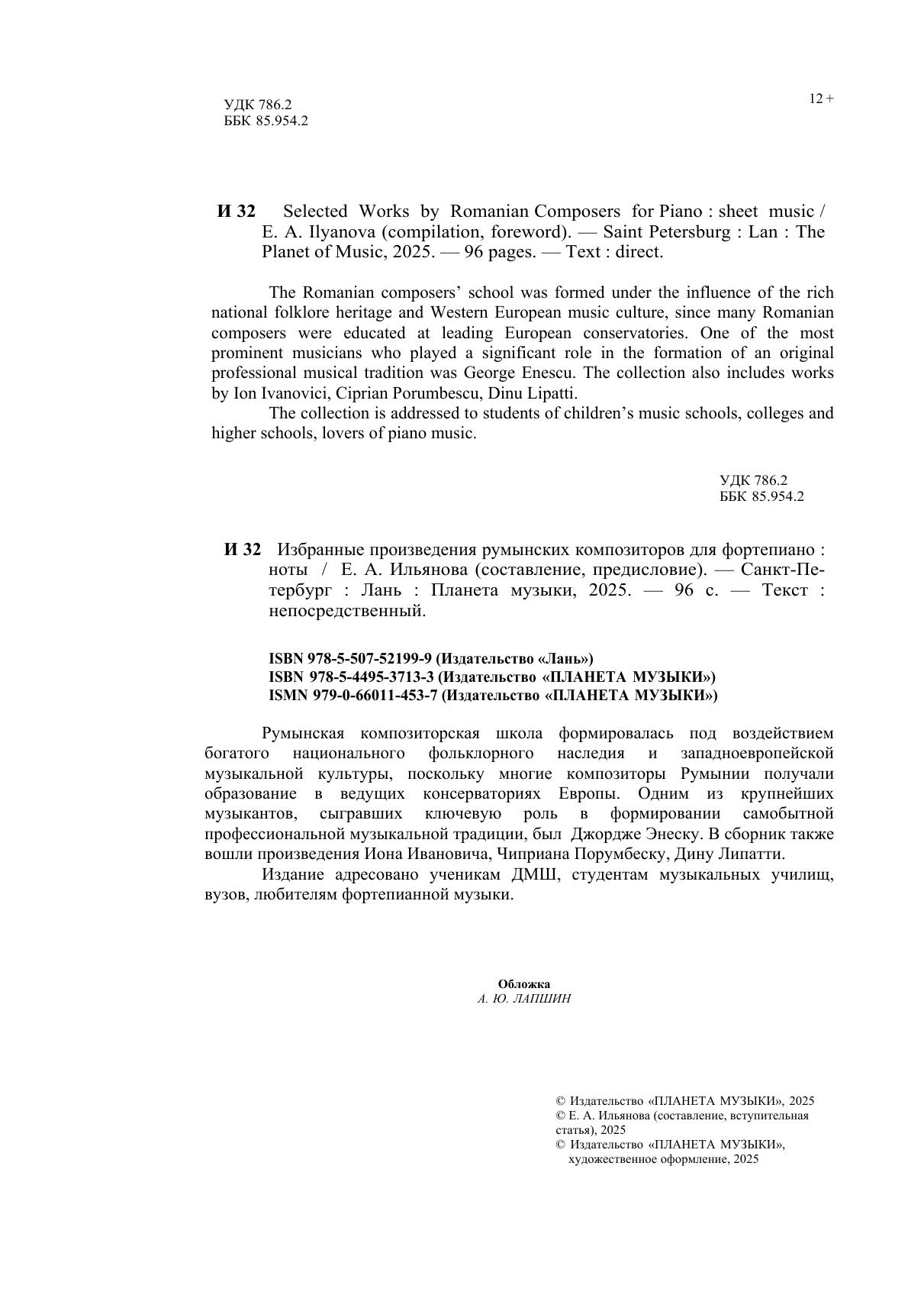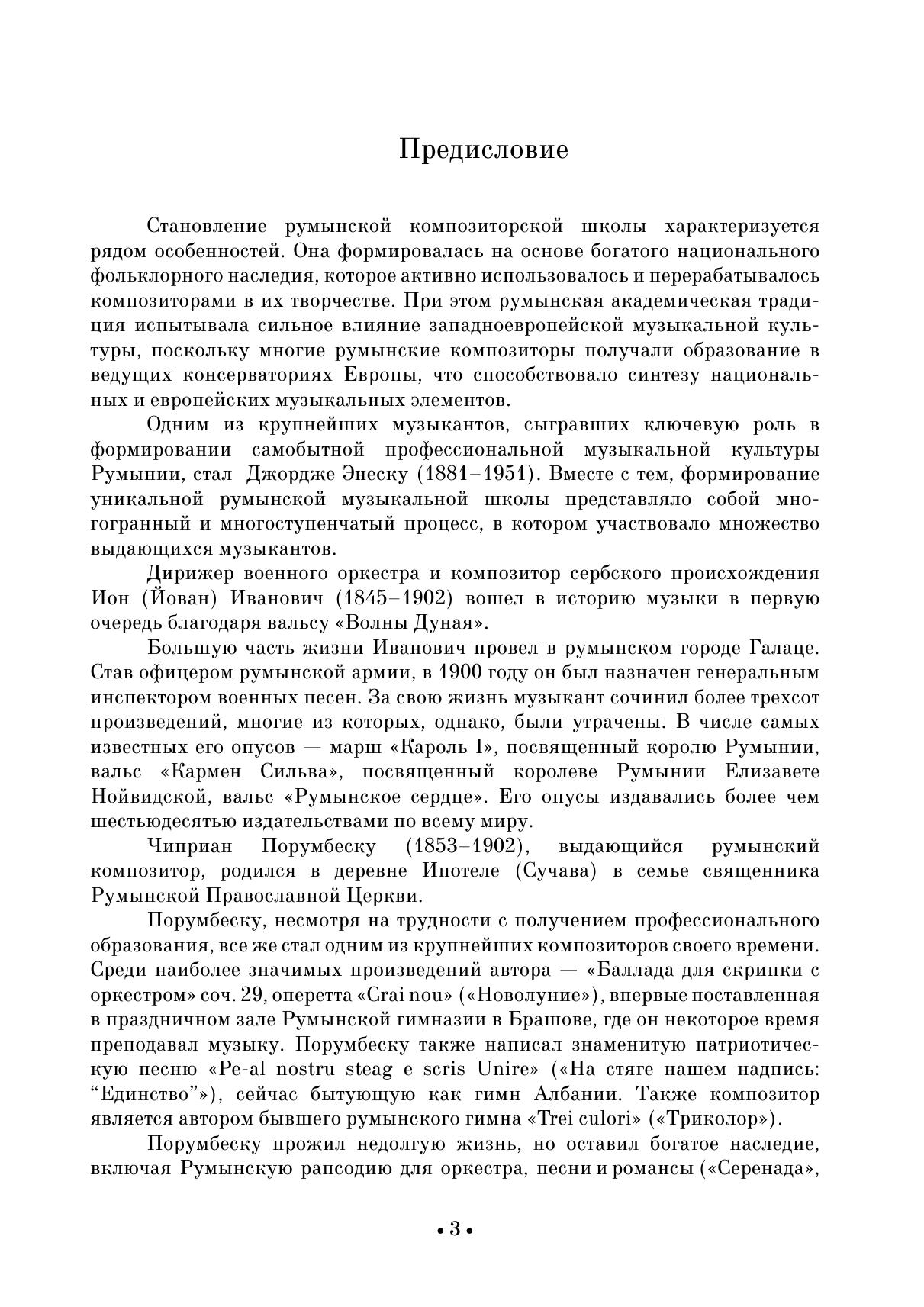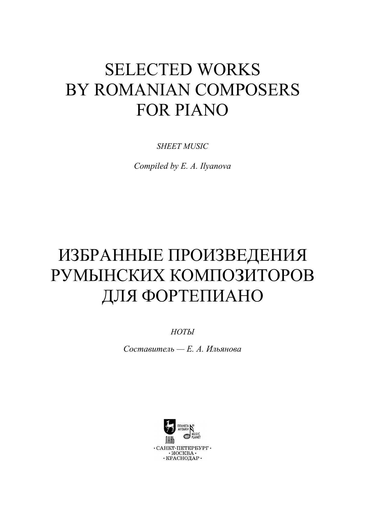 Румынская композиторская школа формировалась под воздействием богатого национального фольклорного наследия и западноевропейской музыкальной культуры, поскольку многие композиторы Румынии получали образование в ведущих консерваториях Европы. Одним из крупнейших музыкантов, сыгравших ключевую роль в формировании самобытной профессиональной музыкальной традиции, был Джордже Энеску. В сборник также вошли произведения Иона Ивановича, Чиприана Порумбеску, Дину Липатти. Издание адресовано ученикам ДМШ, студентам музыкальных училищ, вузов, любителям фортепианной музыки. The Romanian composers’ school was formed under the influence of the rich national folklore heritage and Western European music culture, since many Romanian composers were educated at leading European conservatories. One of the most prominent musicians who played a significant role in the formation of an original professional musical tradition was George Enescu. The collection also includes works by Ion Ivanovici, Ciprian Porumbescu, Dinu Lipatti. The collection is addressed to students of children’s music schools, colleges and higher schools, lovers of piano music.