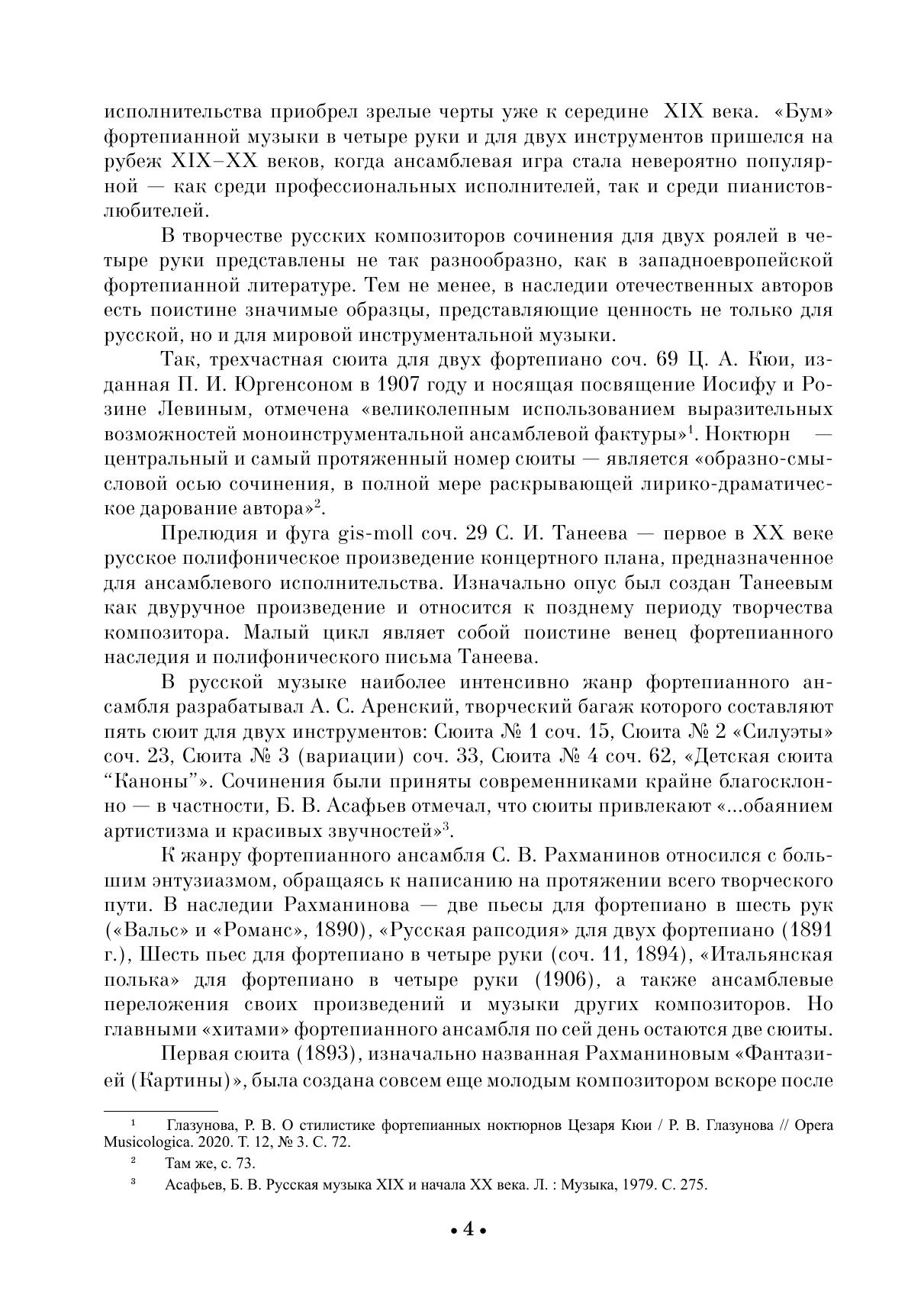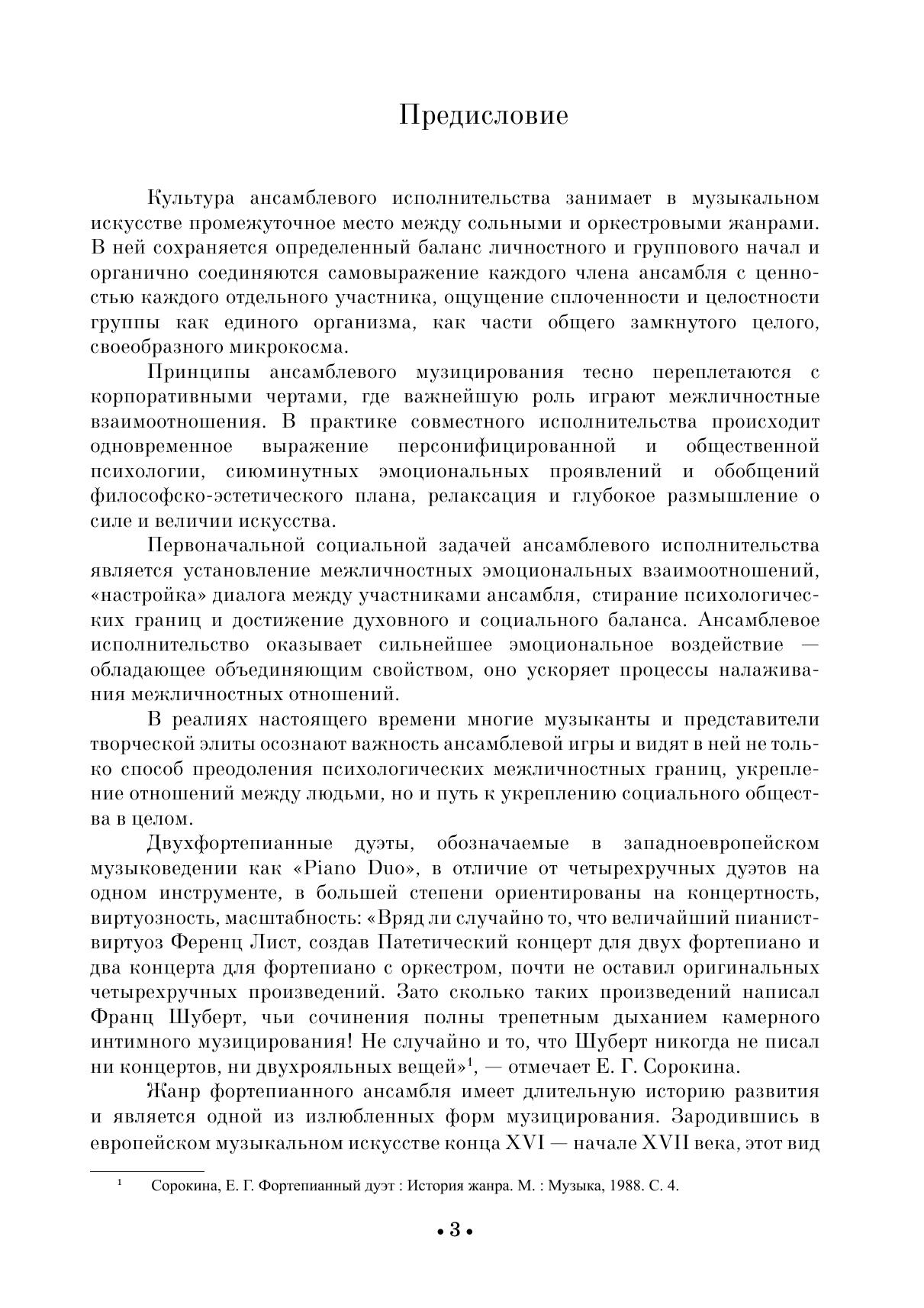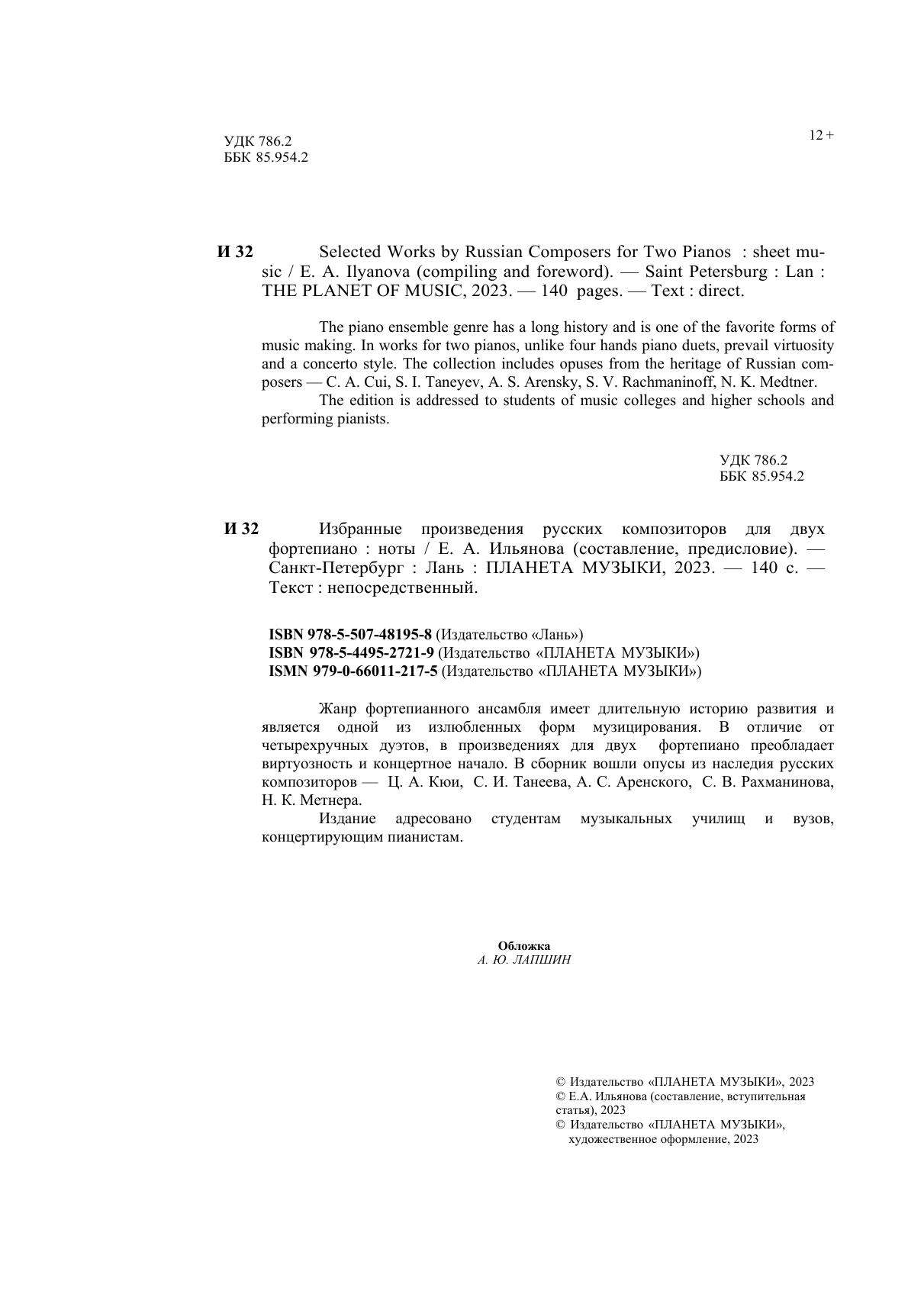 Жанр фортепианного ансамбля имеет длительную историю развития и является одной из излюбленных форм музицирования. В отличие от четырехручных дуэтов, в произведениях для двух фортепиано преобладает виртуозность и концертное начало. В сборник вошли опусы из наследия русских композиторов — Ц. А. Кюи, С. И. Танеева, А. С. Аренского, С. В. Рахманинова, Н. К. Метнера. Издание адресовано студентам музыкальных училищ и вузов, концертирующим пианистам. The piano ensemble genre has a long history and is one of the favorite forms of music making. In works for two pianos, unlike four hands piano duets, prevail virtuosity and a concerto style. The collection includes opuses from the heritage of Russian com-posers — С. A. Cui, S. I. Taneyev, A. S. Arensky, S. V. Rachmaninoff, N. K. Medtner. The edition is addressed to students of music colleges and higher schools and performing pianists.