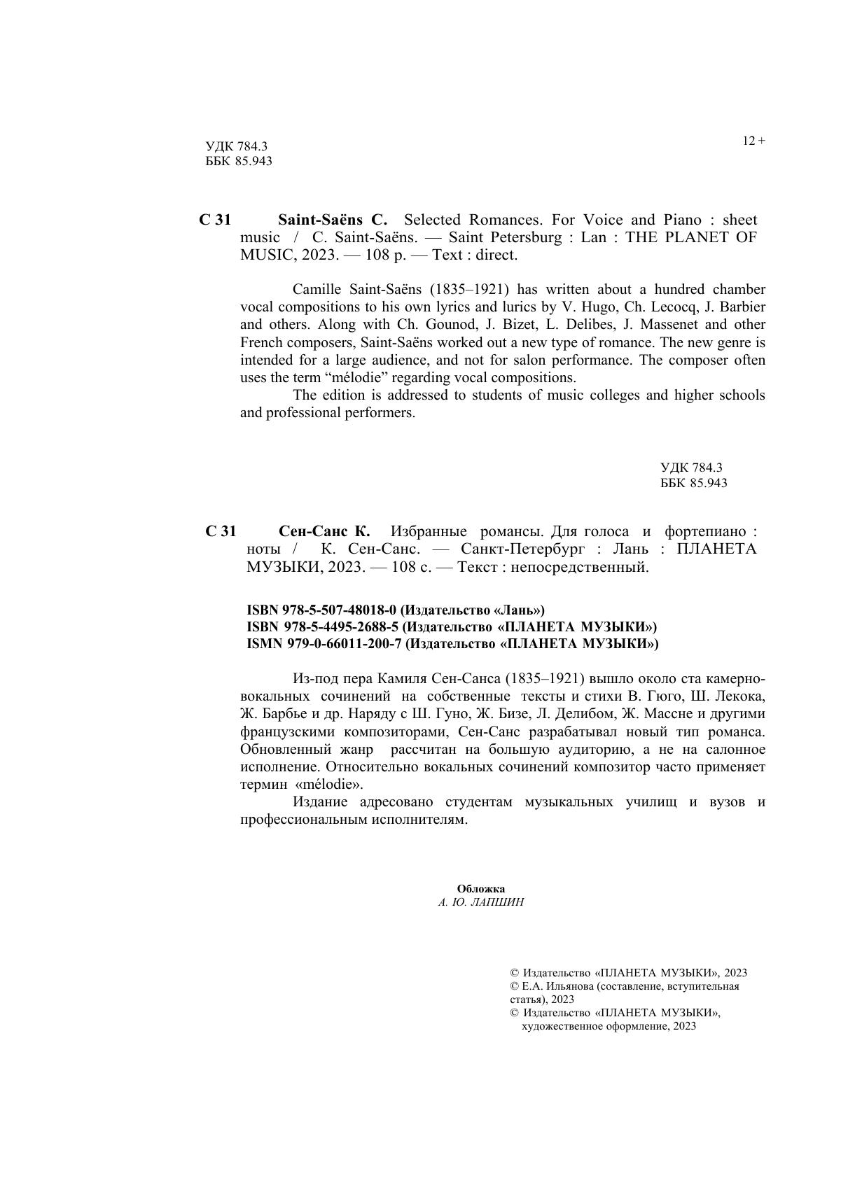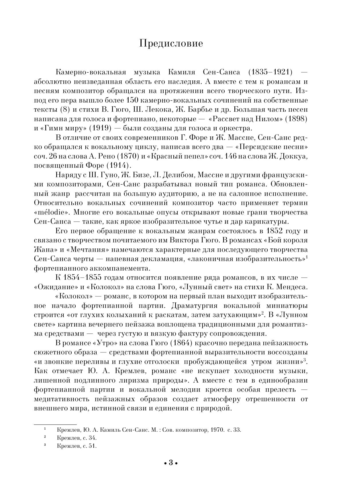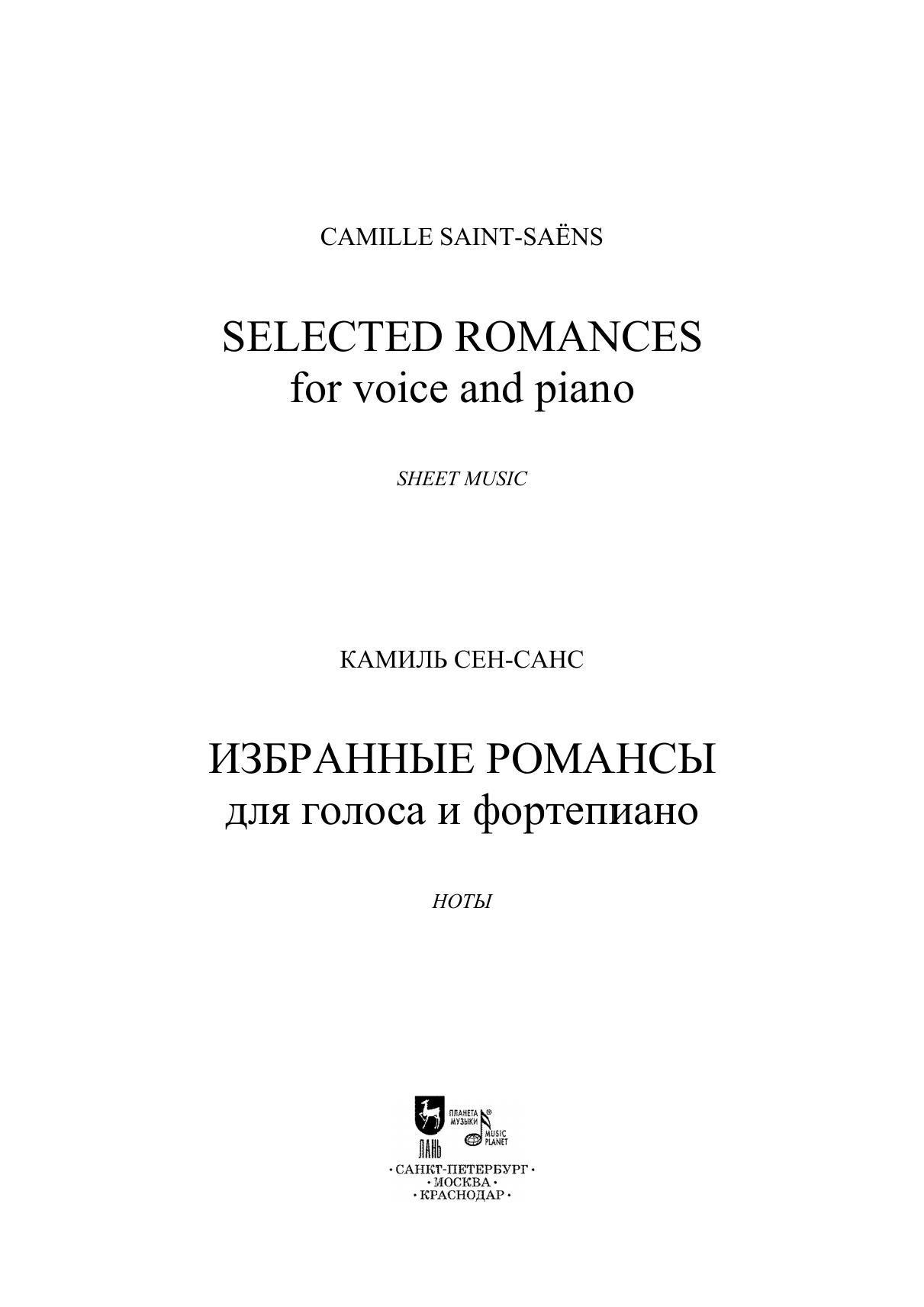 Из-под пера Камиля Сен-Санса (1835-1921) вышло около ста камерно-вокальных сочинений на собственные тексты и стихи В. Гюго, Ш. Лекока, Ж. Барбье и др. Наряду с Ш. Гуно, Ж. Бизе, Л. Делибом, Ж. Массне и другими французскими композиторами,Сен-Санс разрабатывал новый тип романса. Обновленный жанр рассчитан на большую аудиторию, а не на салонное исполнение. Относительно вокальных сочинений композитор часто применяет термин «mélodie». Издание адресовано студентам музыкальных училищ и вузов и профессиональным исполнителям. Camille Saint-Saёns (1835–1921) has written about a hundred chamber vocal compositions to his own lyrics and lurics by V. Hugo, Ch. Lecoсq, J. Barbier and others. Along with Ch. Gounod, J. Bizet, L. Delibes, J. Massenet and other French composers, Saint-Saёns worked out a new type of romance. The new genre is intended for a large audience, and not for salon performance. The composer often uses the term “mélodie” regarding vocal compositions. The edition is addressed to students of music colleges and higher schools and professional performers.