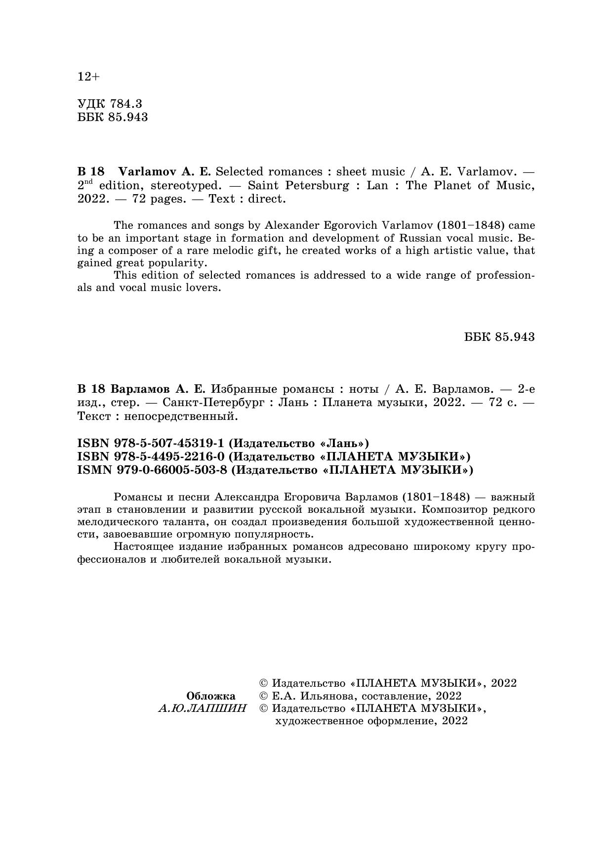 Романсы и песни Александра Егоровича Варламова (1801-1848) — важный этап в становлении и развитии русской вокальной музыки. Композитор редкого мелодического таланта, он создал произведения большой художественной ценности, завоевавшие огромную популярность. Настоящее издание избранных романсов адресовано широкому кругу профессионалов и любителей вокальной музыки.