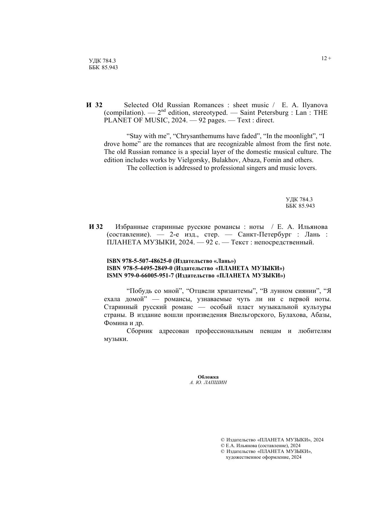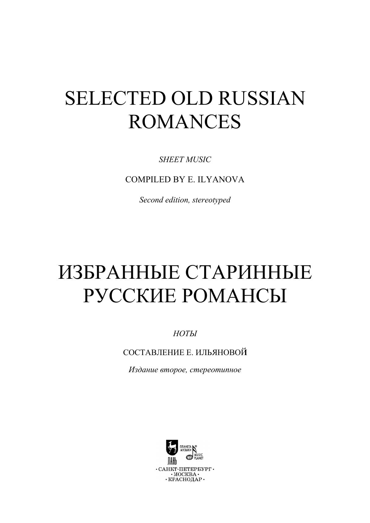 Побудь со мной, "Отцвели хризантемы", "В лунном сиянии", "Я ехала домой" — романсы, узнаваемые чуть ли ни с первой нот. Старинный русский романс — особый пласт музыкальной культуры страны. В издание вошли произведения Виельгорского, Булахова, Абазы, Фомина и др. Сборник адресован профессиональным певцам и любителям музыки. "Stay with me", "Chrysanthemums have faded", "In the moonlight", "I drove home" are the romances that are recognizable almost from the first note. The old Russian romance is a special layer of the domestic musical culture. The edition includes works by Vielgorsky, Bulakhov, Abaza, Fomin and others. The collection is addressed to professional singers and music lovers.