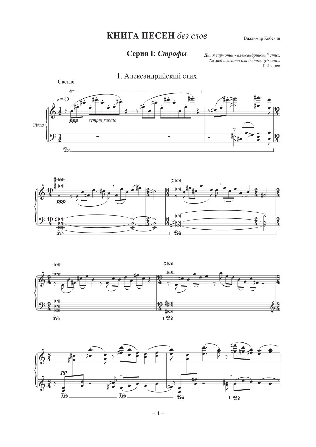 Немецкий мыслитель ХХ века Мартин Хайдеггер писал, что песня (Lied) происходит от laudate –латинского «хвалить». То есть песня, по его мнению, всегда хваление, свет. Песня тесно связана со словом: стихами, поэзией. И это было важно для Владимира Кобекина в те годы, когда создавались 50 пьес для фортепиано «Книги песен» (в общей сложности семь серий).