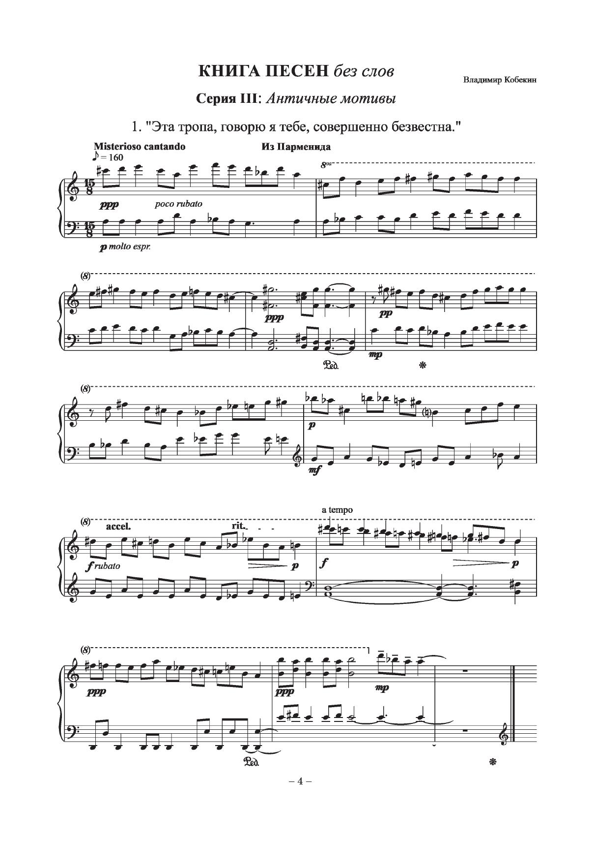 Немецкий мыслитель ХХ века Мартин Хайдеггер писал, что песня (Lied) происходит от laudate –латинского «хвалить». То есть песня, по его мнению, всегда хваление, свет. Песня тесно связана со словом: стихами, поэзией. И это было важно для Владимира Кобекина в те годы, когда создавались 50 пьес для фортепиано «Книги песен» (в общей сложности семь серий).