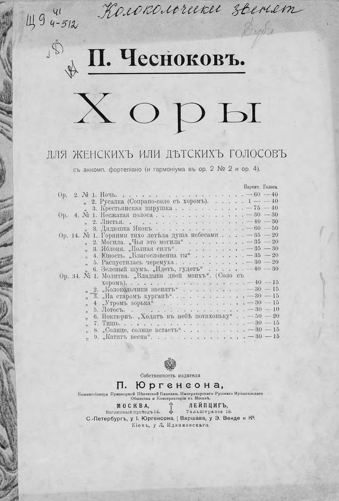 Перешедшие в общественное достояние материалы электронного фонда ЦГПБ им. В.В. Маяковского. Сведения о издательстве или типографии: П. Юргенсон. Место издания: Москва