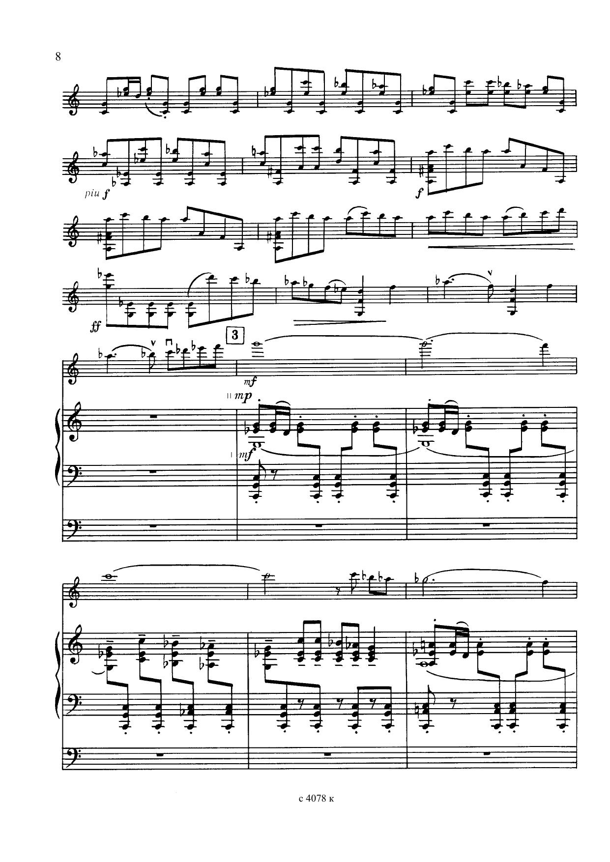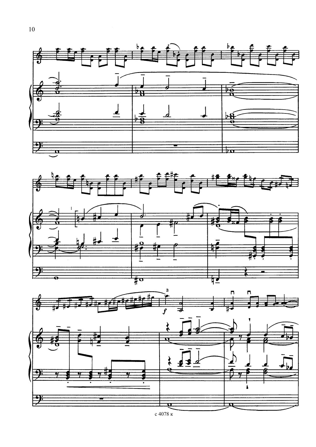 Органная партия концерта может быть исполнена как на инструменте, имеющем 3 клавиатуры, так и 30–50 регистров. Что касается регистровки, то органисту следует проявить осторожность в применении микстур, особенно высоких. Это ограничение, конечно, не относится к сольным и, тем более, кульминационным «высказываниям» органа. Наличие швеллеров поможет двум участникам романтического диалога — скрипке и органу — установить между собой контакт.