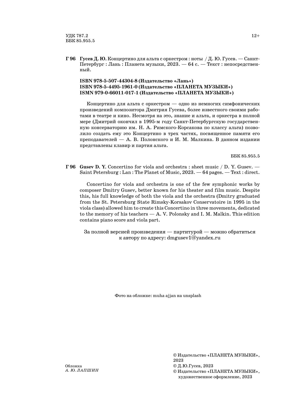 Концертино для альта с оркестром — одно из немногих симфонических произведений композитора Дмитрия Гусева, более известного своими работами в театре и кино. Несмотря на это, знание и альта, и оркестра в полной мере (Дмитрий окончил в 1995-ом году Санкт-Петербургскую государственную консерваторию им. Н. А. Римского-Корсакова по классу альта) позволило создать ему это Концертино в трех частях, посвященное памяти его преподавателей — А. В. Полонского и И. М. Малкина.