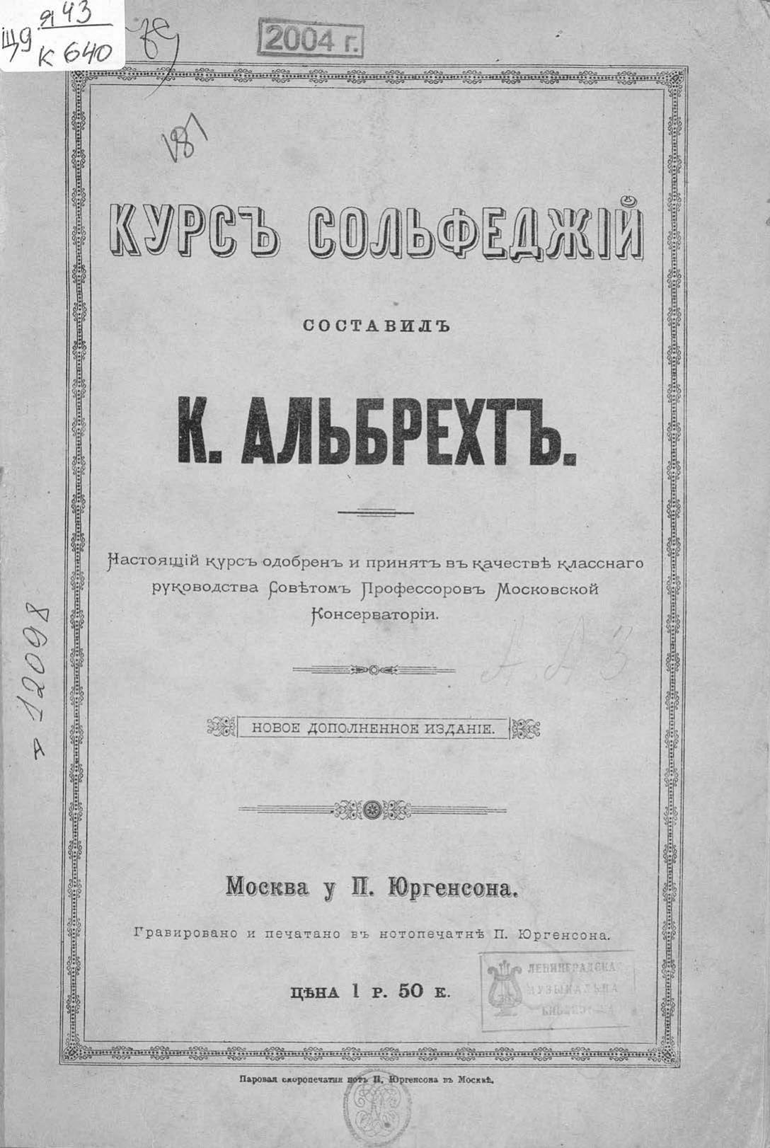 Перешедшие в общественное достояние материалы электронного фонда ЦГПБ им. В.В. Маяковского. Сведения о издательстве или типографии: П. Юргенсон. Место издания: Москва