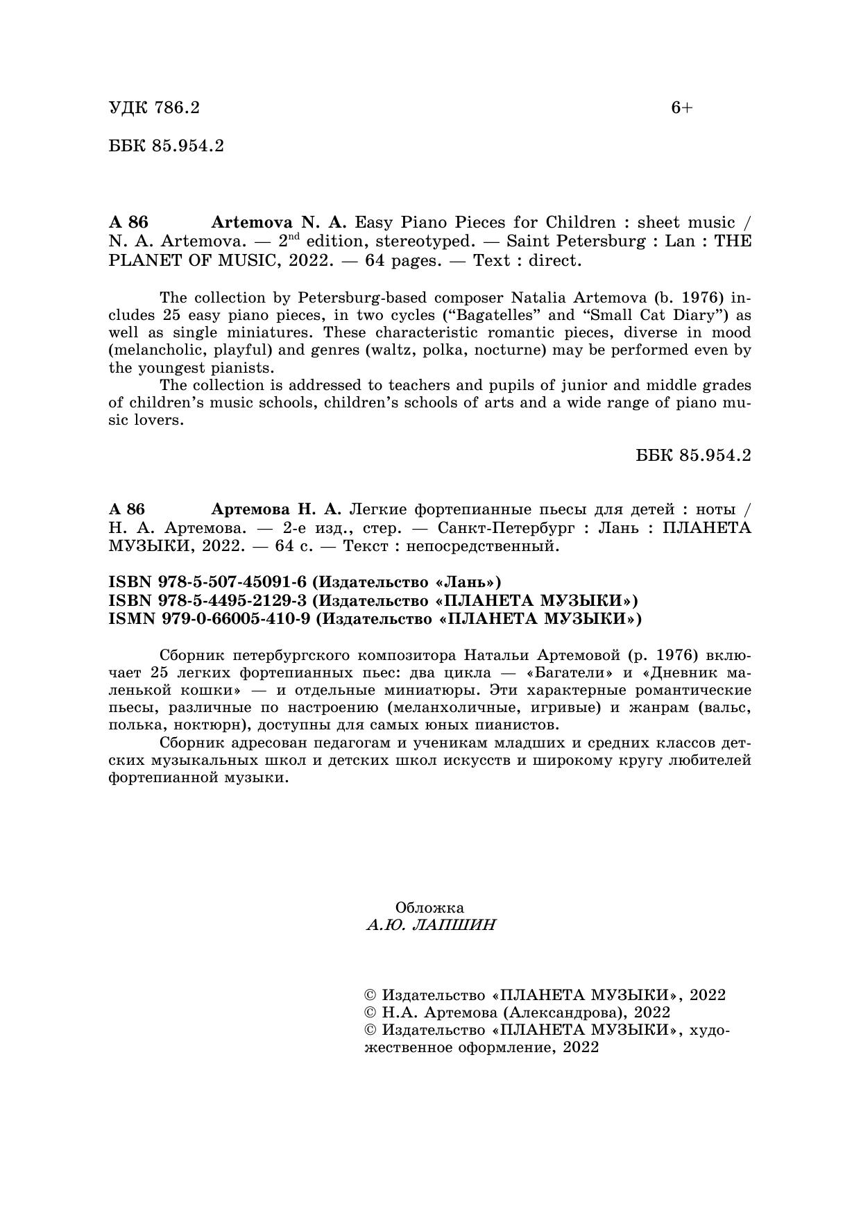 Сборник петербургского композитора Натальи Артемовой (р. 1976) включает 25 легких фортепианных пьес: два цикла – «Багатели» и «Дневник маленькой кошки» – и отдельные миниатюры. Эти характерные романтические пьесы, различные по настроению (меланхоличные, игривые) и жанрам (вальс, полька, ноктюрн), доступны для самых юных пианистов.