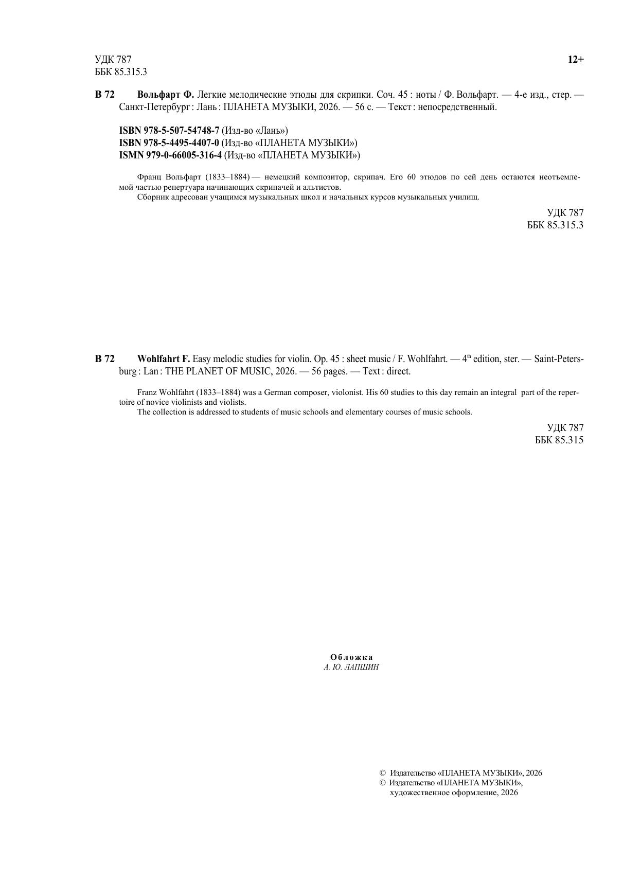 Франц Вольфарт (1833-1884) — немецкий композитор, скрипач. Его 60 этюдов по сей день остаются неотъемлемой частью репертуара начинающих скрипачей и альтистов. Сборник адресован учащимся музыкальных школ и начальных курсов музыкальных училищ.