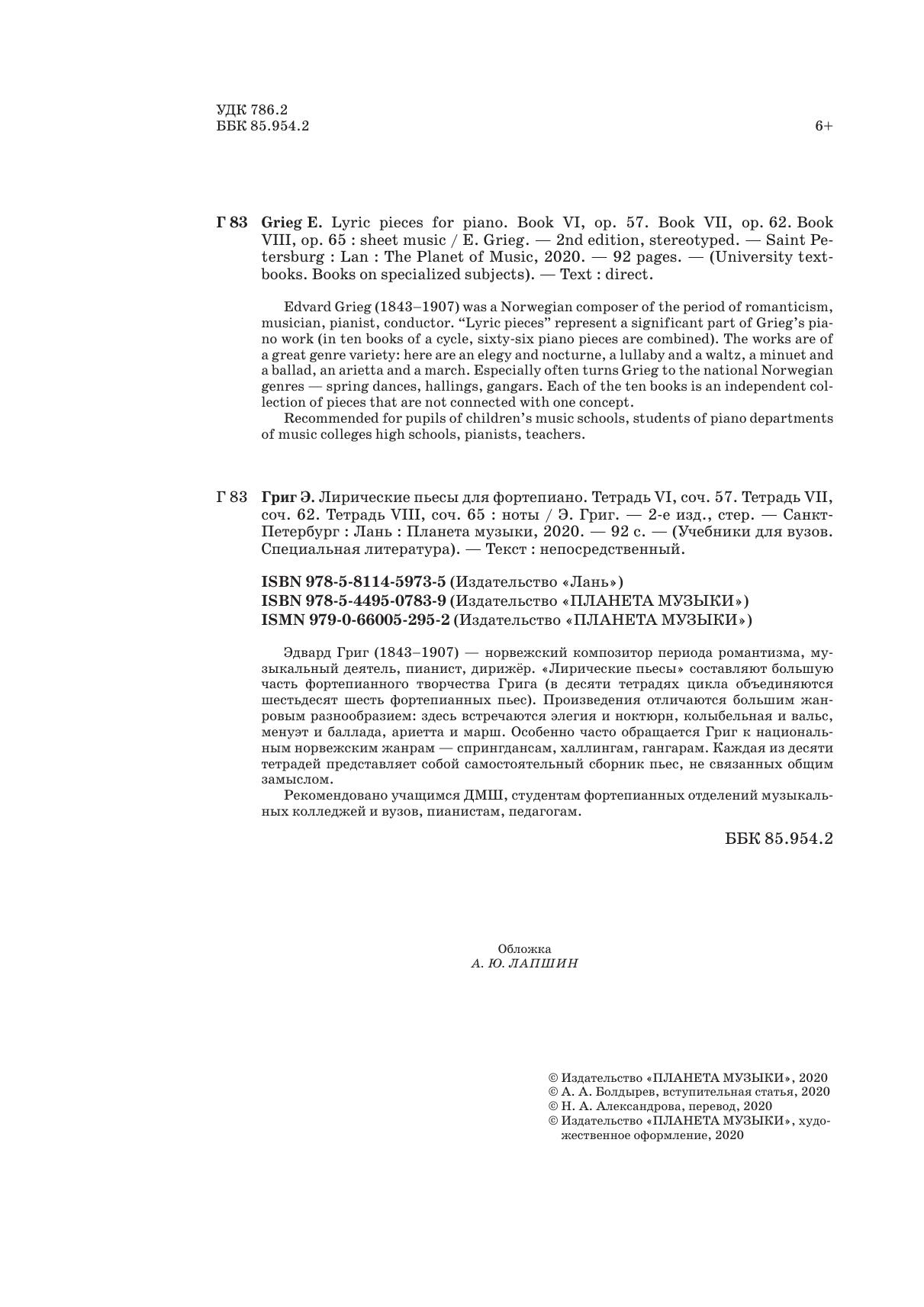 Лирические пьесы для фортепиано. Тетрадь VI, соч. 57. Тетрадь VII, соч. 62. Тетрадь VIII, соч. 65.