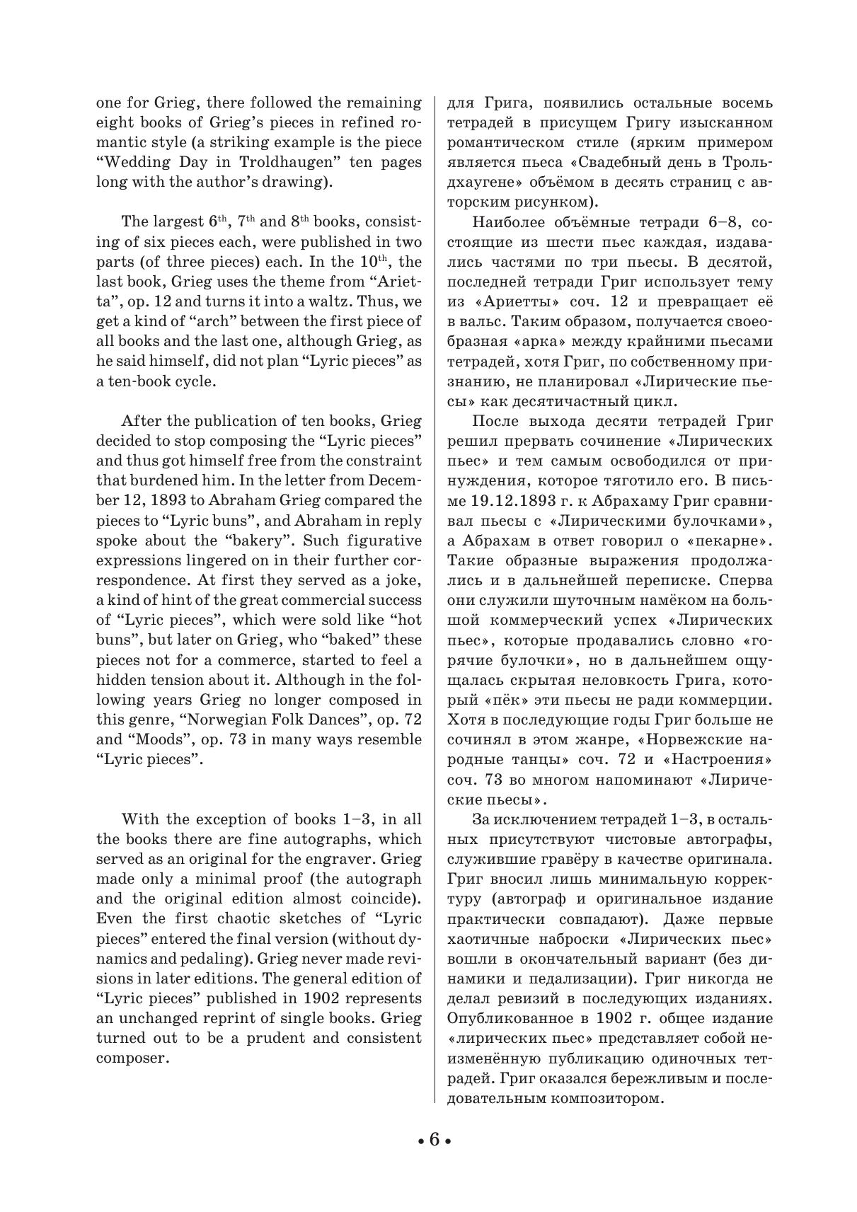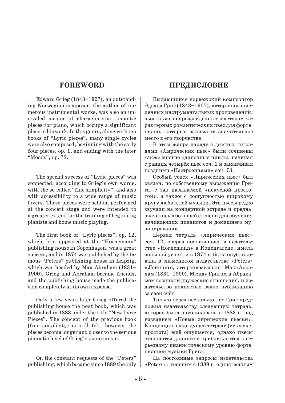 Эдвард Григ (1843 — 1907) — норвежский композитор периода романтизма, музыкальный деятель, пианист, дирижёр. «Лирические пьесы» составляют большую часть фортепианного творчества Грига (в десяти тетрадях цикла объединяются шестьдесят шесть фортепианных пьес). Произведения отличаются большим жанровым разнообразием: здесь встречаются элегия и ноктюрн, колыбельная и вальс, менуэт и баллада, ариетта и марш. Особенно часто обращается Григ к национальным норвежским жанрам – спрингдансам, халлингам, гангарам. Каждая из десяти тетрадей представляет собой самостоятельный сборник пьес, не связанных общим замыслом. Рекомендовано учащимся ДМШ, студентам фортепианных отделений музыкальных колледжей и вузов, пианистам, педагогам.