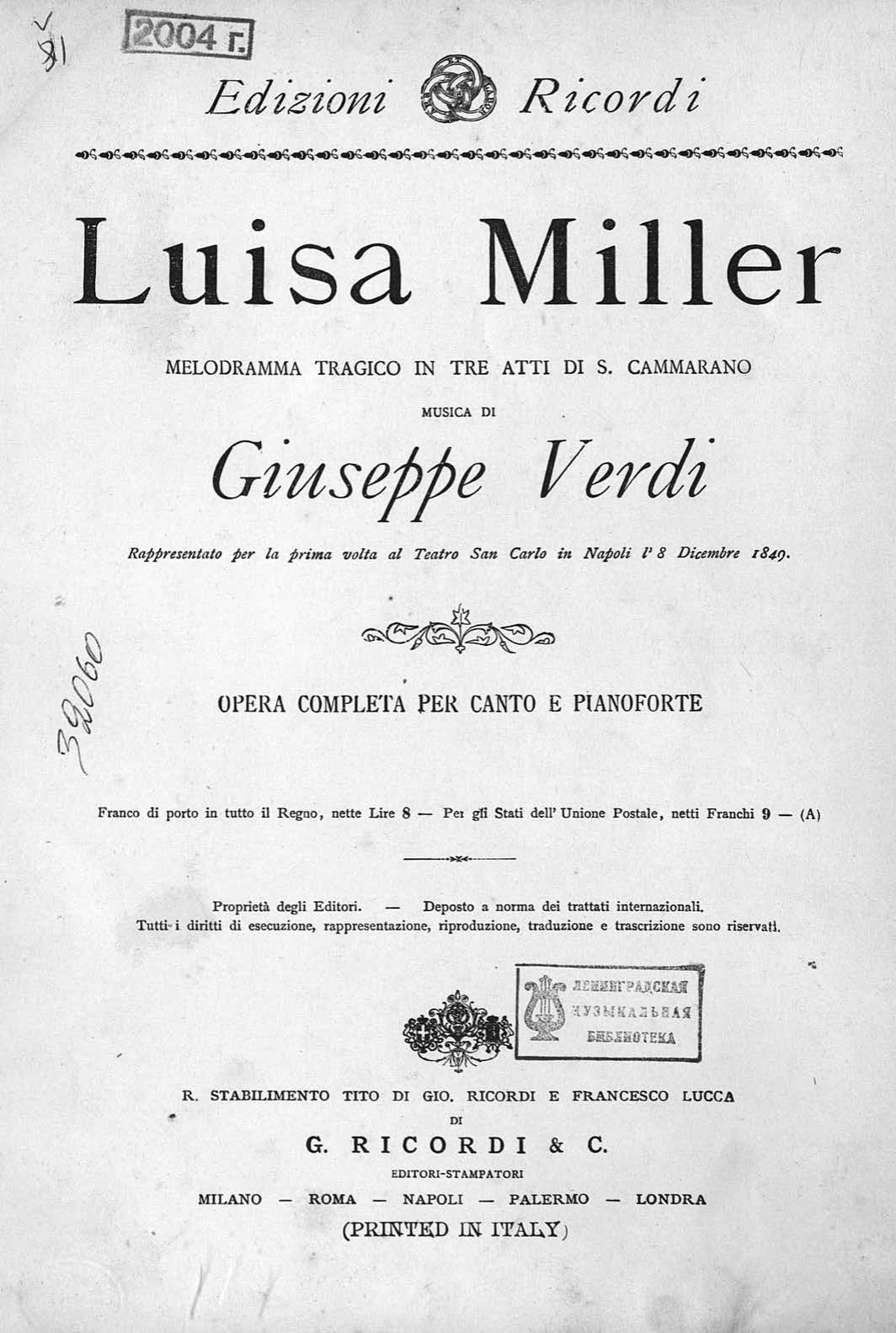 Перешедшие в общественное достояние материалы электронного фонда ЦГПБ им. В.В. Маяковского. Сведения о издательстве или типографии: G. Ricordi & C. Место издания: Милан