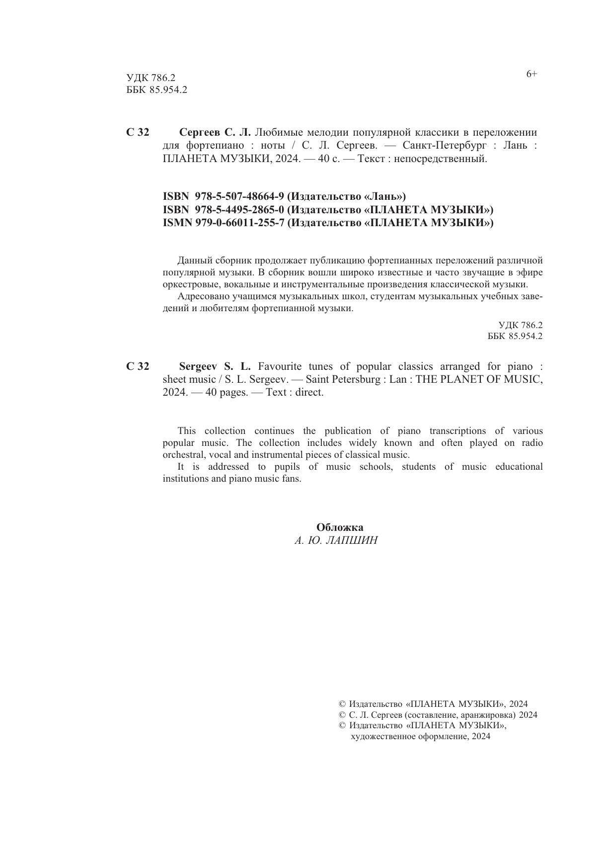 Данный сборник продолжает публикацию фортепианных переложений различной популярной музыки. В сборник вошли широко известные и часто звучащие в эфире оркестровые, вокальные и инструментальные произведения классической музыки. Адресовано учащимся музыкальных школ, студентам музыкальных учебных заведений и любителям фортепианной музыки. This collection continues the publication of piano transcriptions of various popular music. The collection includes widely known and often played on radio orchestral, vocal and instrumental pieces of classical music. It is addressed to pupils of music schools, students of music educational institutions and piano music fans.