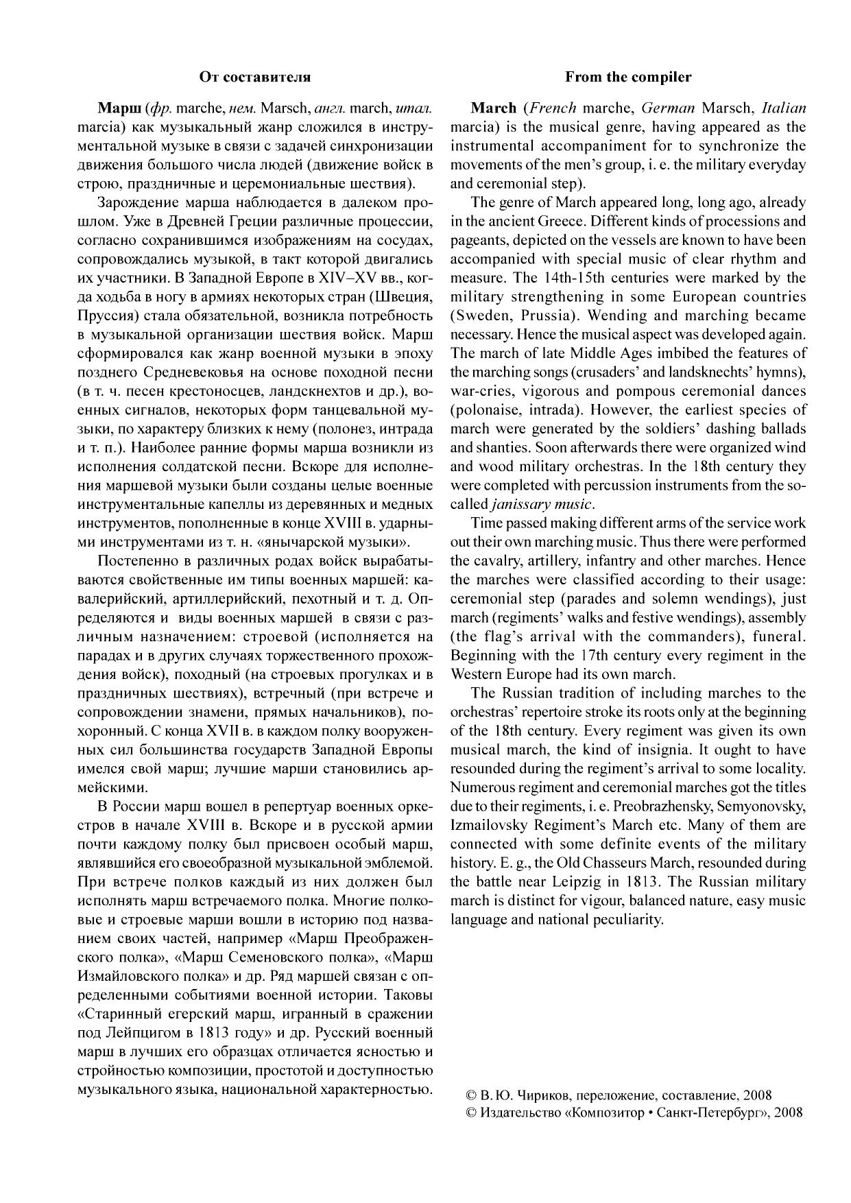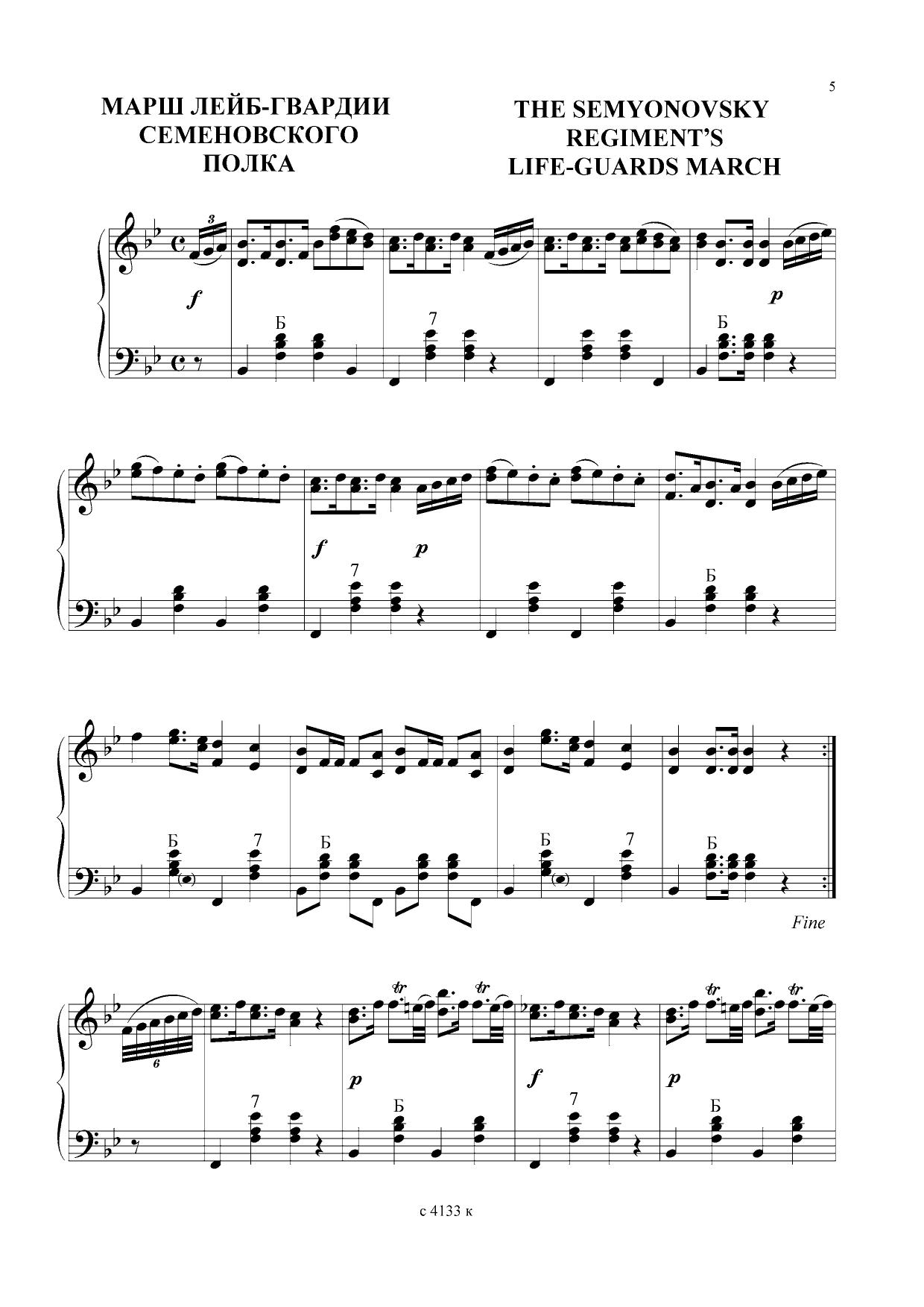 В России марш вошел в репертуар военных оркестров в начале XVIII в. Вскоре и в русской армии почти каждому полку был присвоен особый марш, являвшийся его своеобразной музыкальной эмблемой. При встрече полков каждый из них должен был исполнять марш встречаемого полка. Многие полковые и строевые марши вошли в историю под названием своих частей, например «Марш Преображенского полка», «Марш Семеновского полка», «Марш Измайловского полка» и др. Ряд маршей связан с определенными событиями военной истории. Таковы «Старинный егерский марш, игранный в сражении под Лейпцигом в 1813 году» и др. Русский военный марш в лучших его образцах отличается ясностью и стройностью композиции, простотой и доступностью музыкального языка, национальной характерностью.