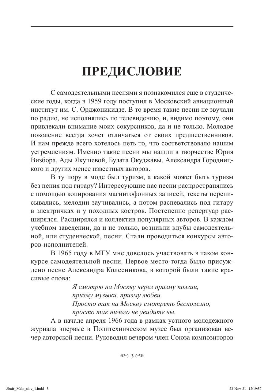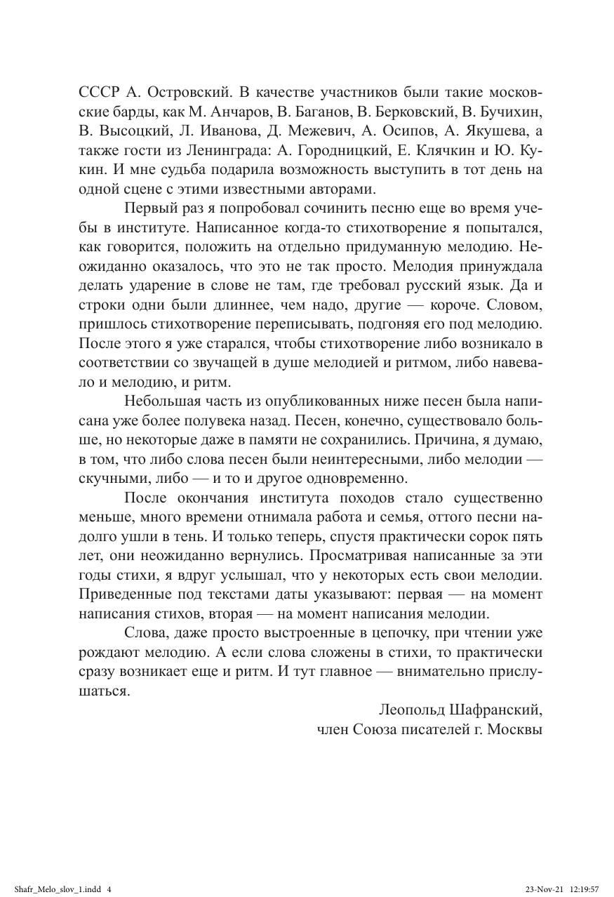В этой книге собраны песни, слова и мелодии к которым написаны автором. Автор является членом Союза писателей Москвы. Его стихи публиковались в различных сборниках, в 2004 году была издана книга «В пространстве заоконном», в 2014 году — книга «Любимая, осень…», а в 2017 году — книга «Солнце целится в лицо».