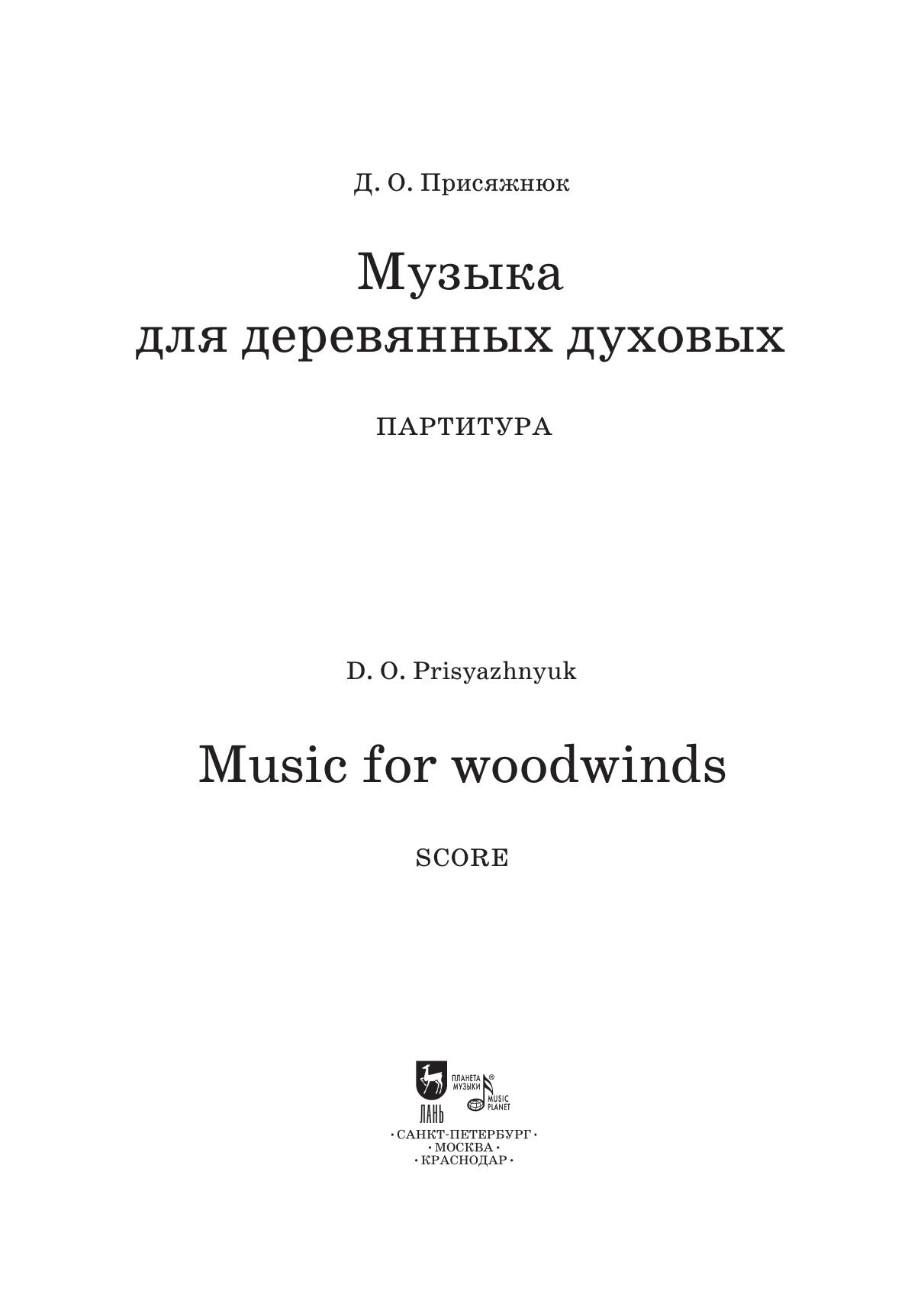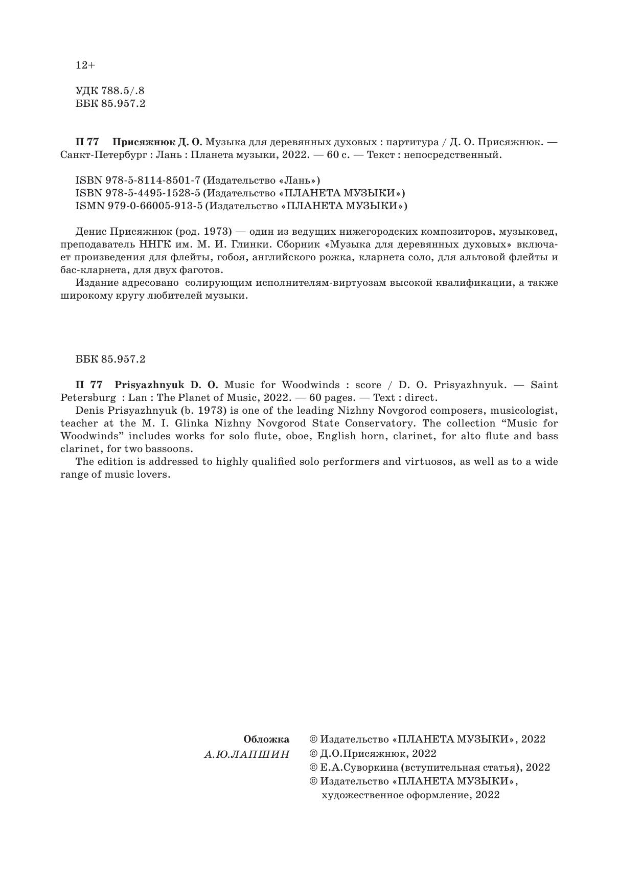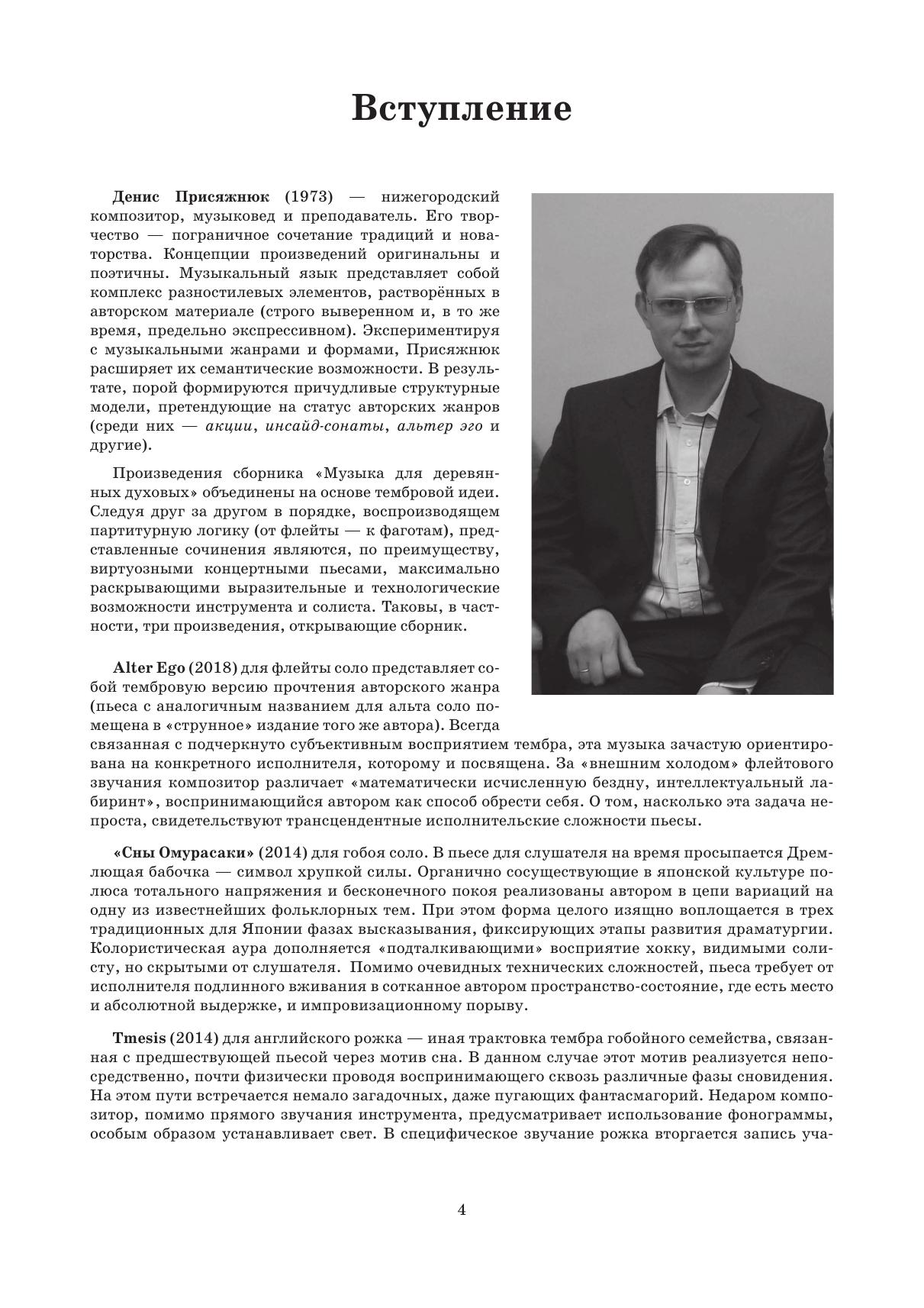 Денис Присяжнюк (род. 1973) – один из ведущих нижегородских композиторов, музыковед, преподаватель ННГК им. М. И. Глинки. Сборник “Музыка для деревянных” включает произведения для флейты, гобоя, английского рожка, кларнета соло, для альтовой флейты и бас-кларнета, для двух фаготов. Издание адресовано солирующим исполнителям-виртуозам высокой квалификации, а также широкому кругу любителей музыки.