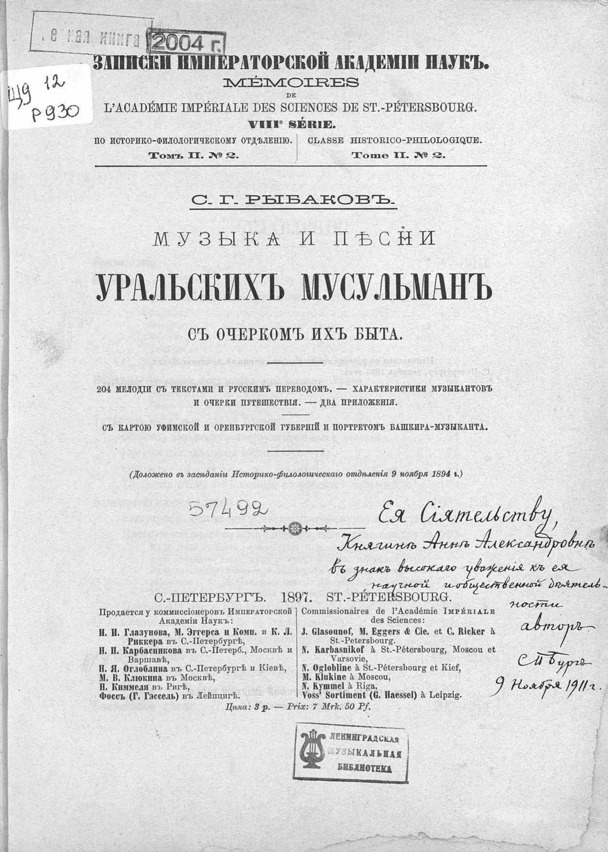 Перешедшие в общественное достояние материалы электронного фонда ЦГПБ им. В.В. Маяковского. Сведения о издательстве или типографии: Императорская Академия Наук. Место издания: Санкт-Петербург