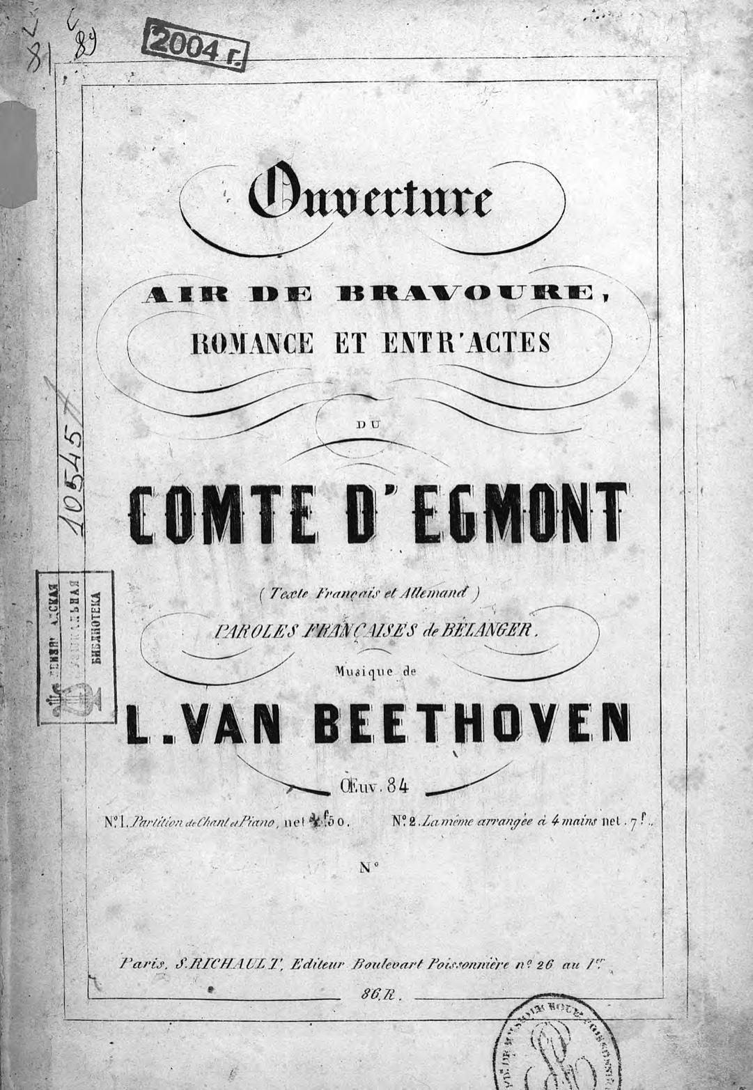 Ouverture air de Bravoure, Romance et entr' actes du Comte d'Egmont