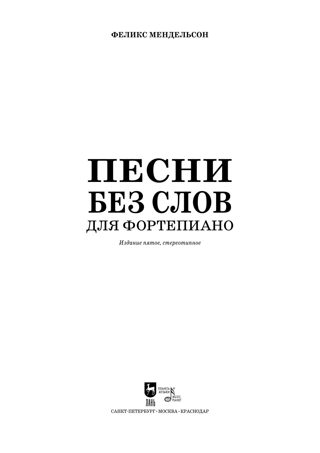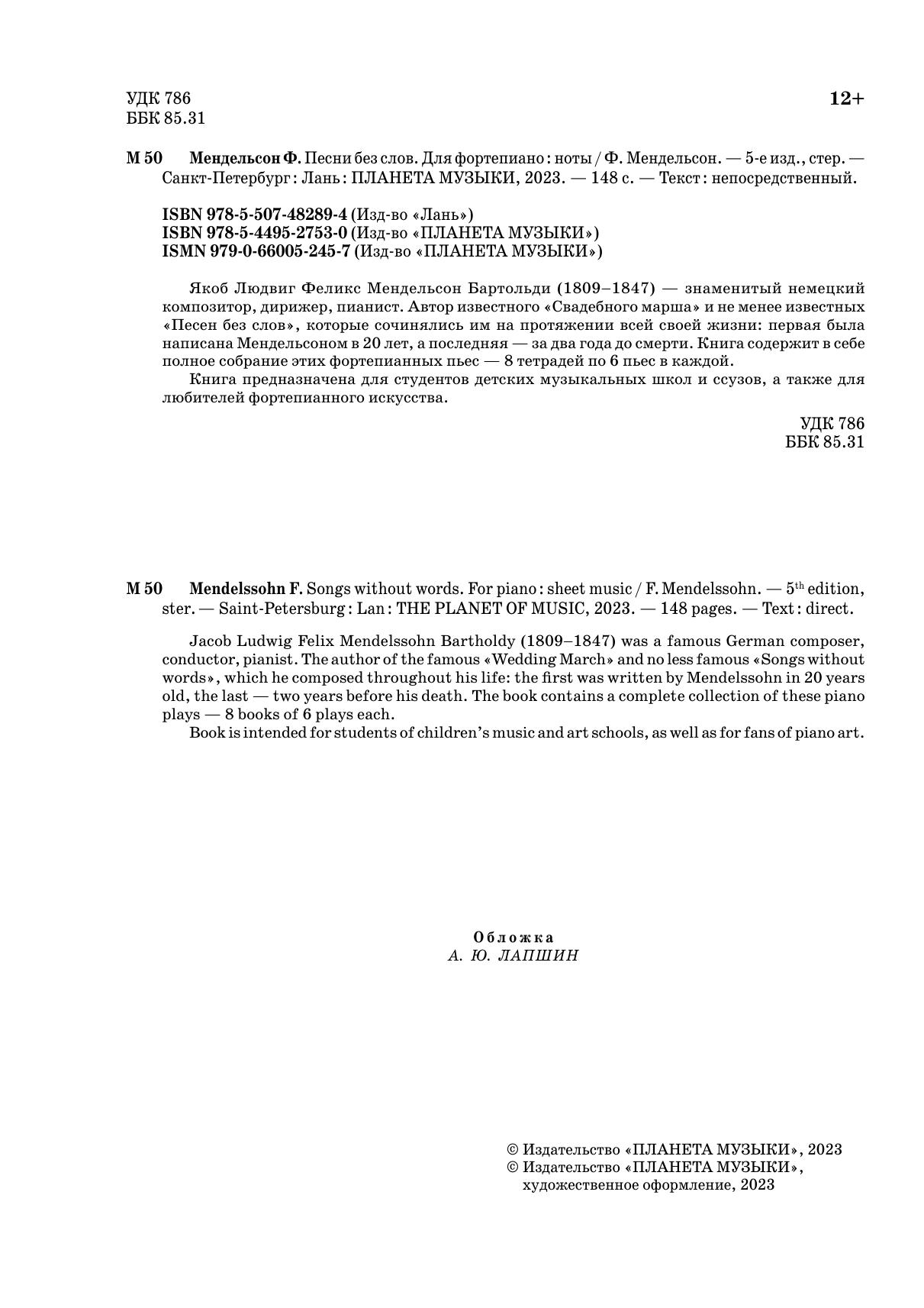 Якоб Людвиг Феликс Мендельсон Бартольди (1809–1847) — знаменитый немецкий композитор, дирижер, пианист. Автор известного «Свадебного марша» и не менее известных «Песен без слов», которые сочинялись им на протяжении всей своей жизни: первая была написана Мендельсоном в 20 лет, в последняя — за два года до смерти. Книга содержит в себе полное собрание этих фортепианных пьес — 8 тетрадей по 6 пьес в каждой. Предназначена для студентов детских музыкальных школ и ссузов, а также для любителей фортепианного искусства. Jacob Ludwig Felix Mendelssohn Bartholdy (1809–1847) was a famous German composer, conductor, pianist. The author of the famous «Wedding March» and no less famous «Songs without words», which he composed throughout his life: the first was written by Mendelssohn in 20 years old, the last — two years before his death. The book contains a complete collection of these piano plays — 8 books of 6 plays each. Book is intended for students of children’s music and art schools, as well as for fans of piano art.