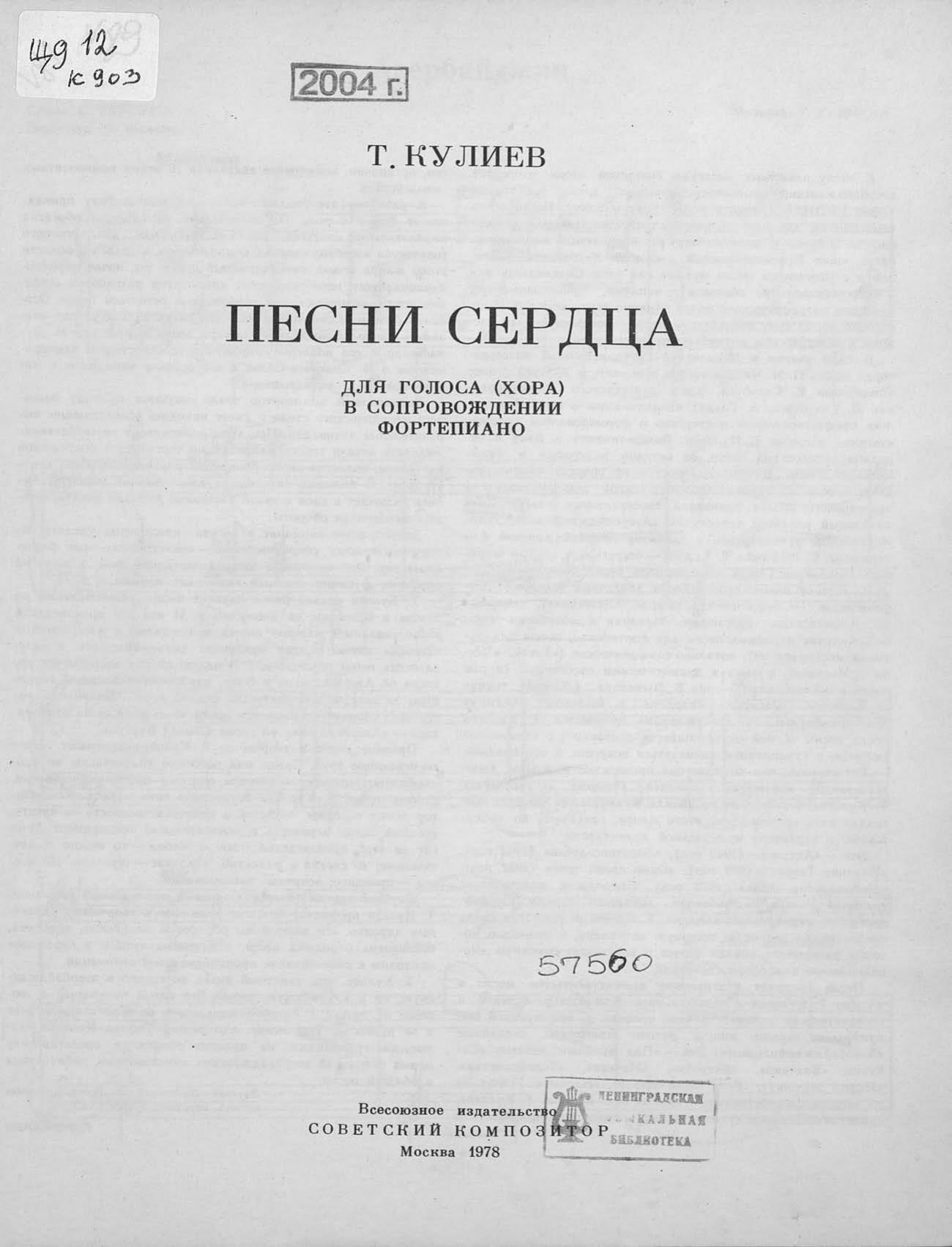 Перешедшие в общественное достояние материалы электронного фонда ЦГПБ им. В.В. Маяковского. Сведения о издательстве или типографии: Советский композитор. Место издания: Москва
