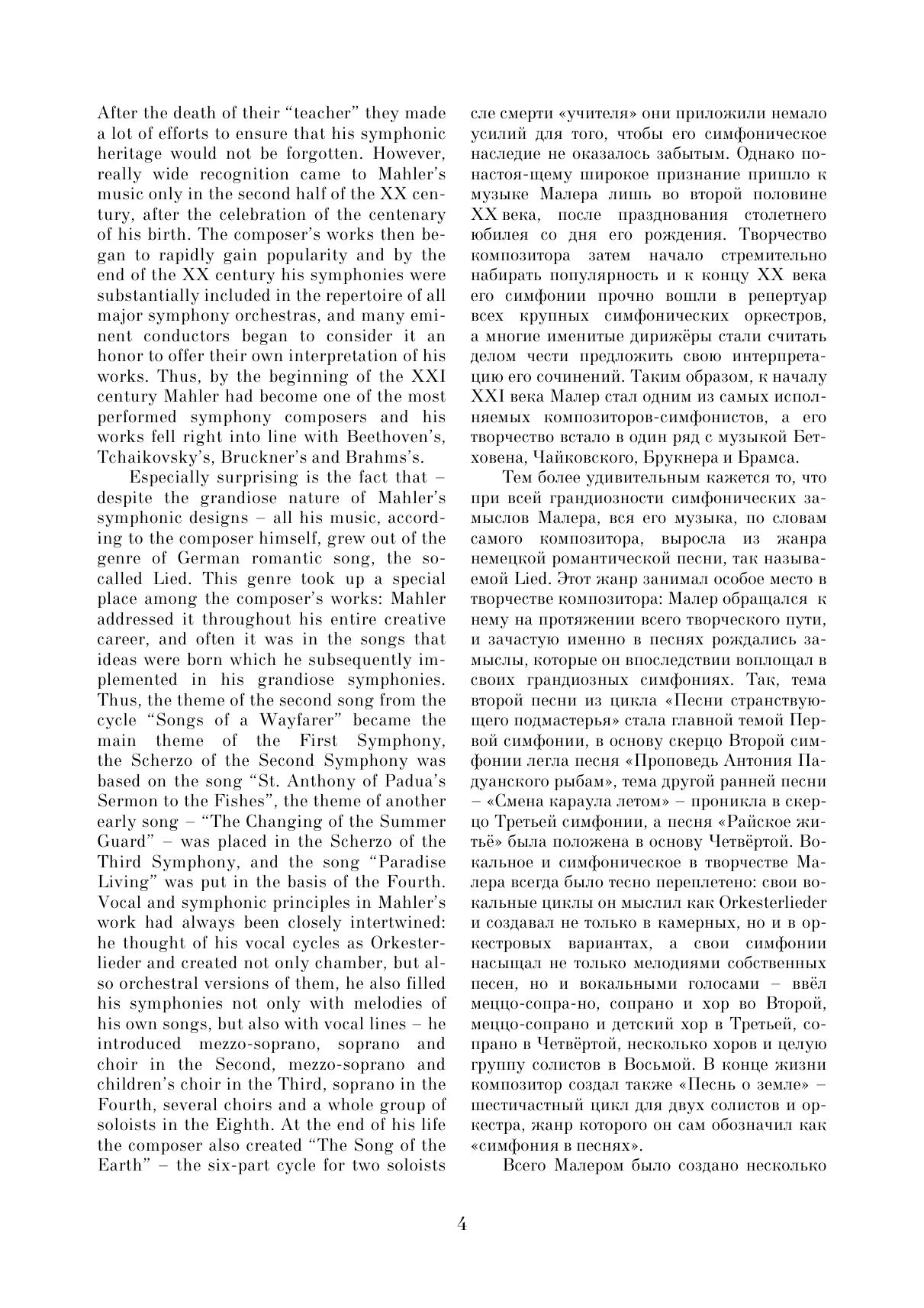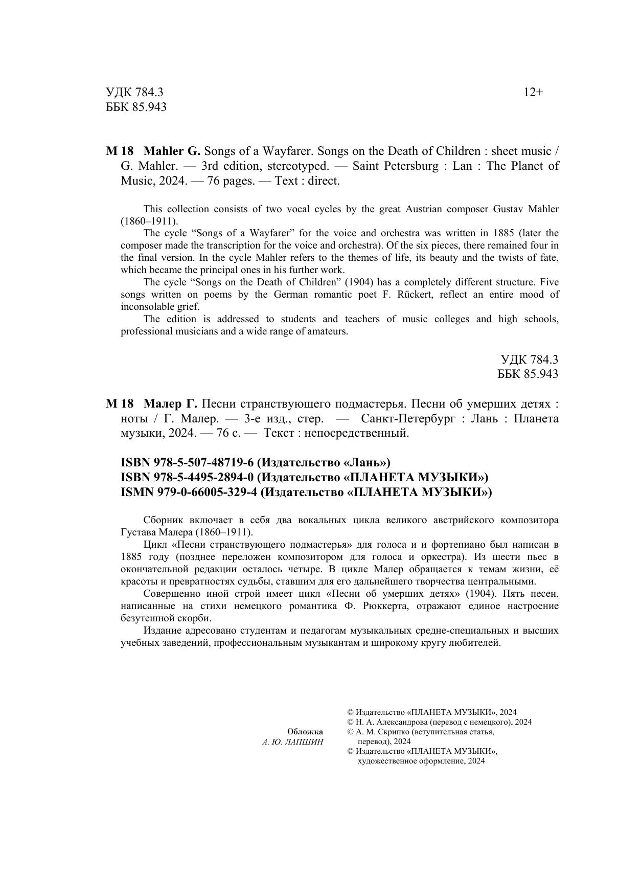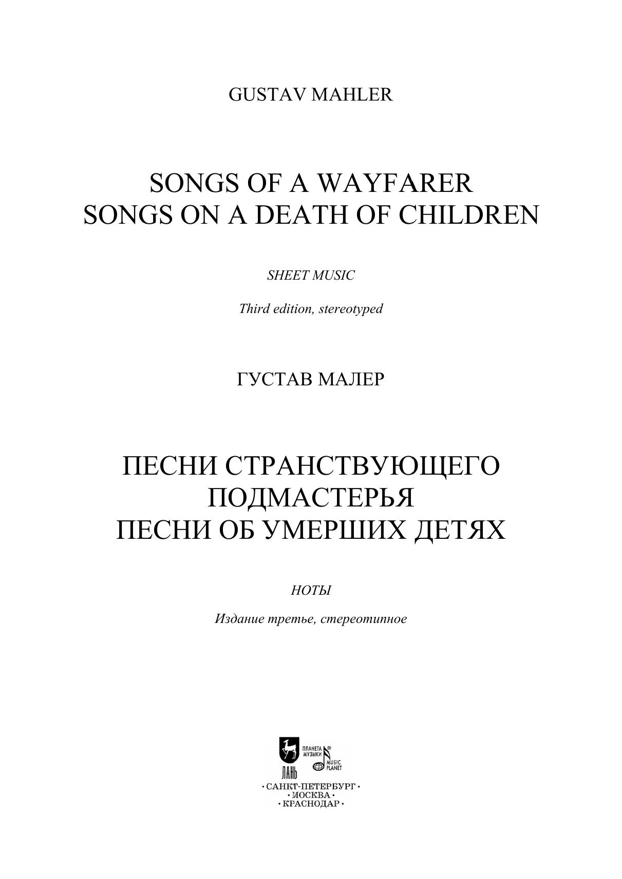 Настоящий сборник состоит из двух вокальных циклов крупнейшего австрийского композитора Густава Малера (1860-1911). Цикл «Песни странствующего подмастерья» для голоса и и фортепиано был написан в 1885 году (позднее переложен композитором для голоса и оркестра). Из шести пьес в окончательной редакции осталось четыре. В цикле Малер обращается к темам жизни, ее красоте и превратностях судьбы, ставшими для его дальнейшего творчества центральными. Совершенно иной строй имеет цикл «Песни об умерших детях» (1904). Пять песен, написанные на стихи немецкого романтика Ф. Рюккерта, отражают единое настроение безутешной скорби. Издание адресовано студентам и педагогам музыкальных средне-специальных и высших учебных заведений, профессиональным музыкантам и широкому кругу любителей.