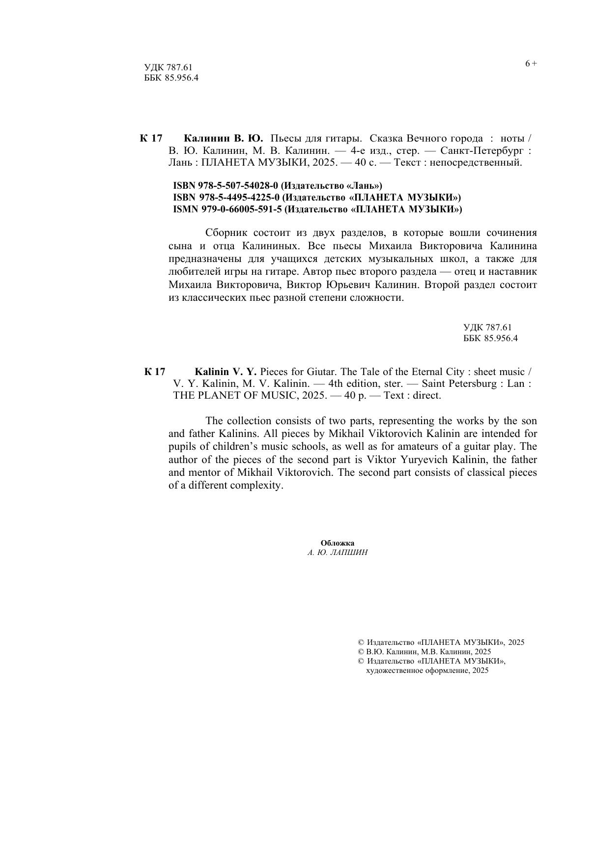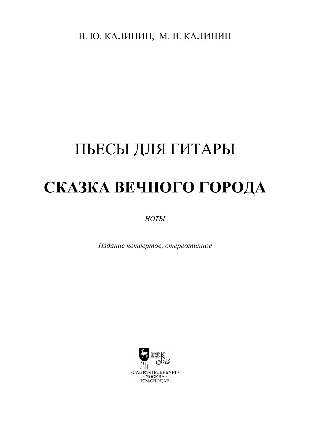 Сборник состоит из двух разделов, в которые вошли сочинения сына и отца Калининых. Все пьесы Михаила Викторовича Калинина предназначены для учащихся детских музыкальных школ, а также для любителей игры на гитаре. Автор пьес второго раздела— отец и наставник Михаила Викторовича, Виктор Юрьевич Калинин. Второй раздел состоит из классических пьес разной степени сложности. The collection consists of two parts, representing the works by the son and father Kalinins. All pieces by Mikhail Viktorovich Kalinin are intended for pupils of children's music schools, as well as for amateurs of a guitar play. The author of the pieces of the second part is Viktor Yuryevich Kalinin, the father and mentor of Mikhail Viktorovich. The second part consists of classical pieces of a different complexity.
