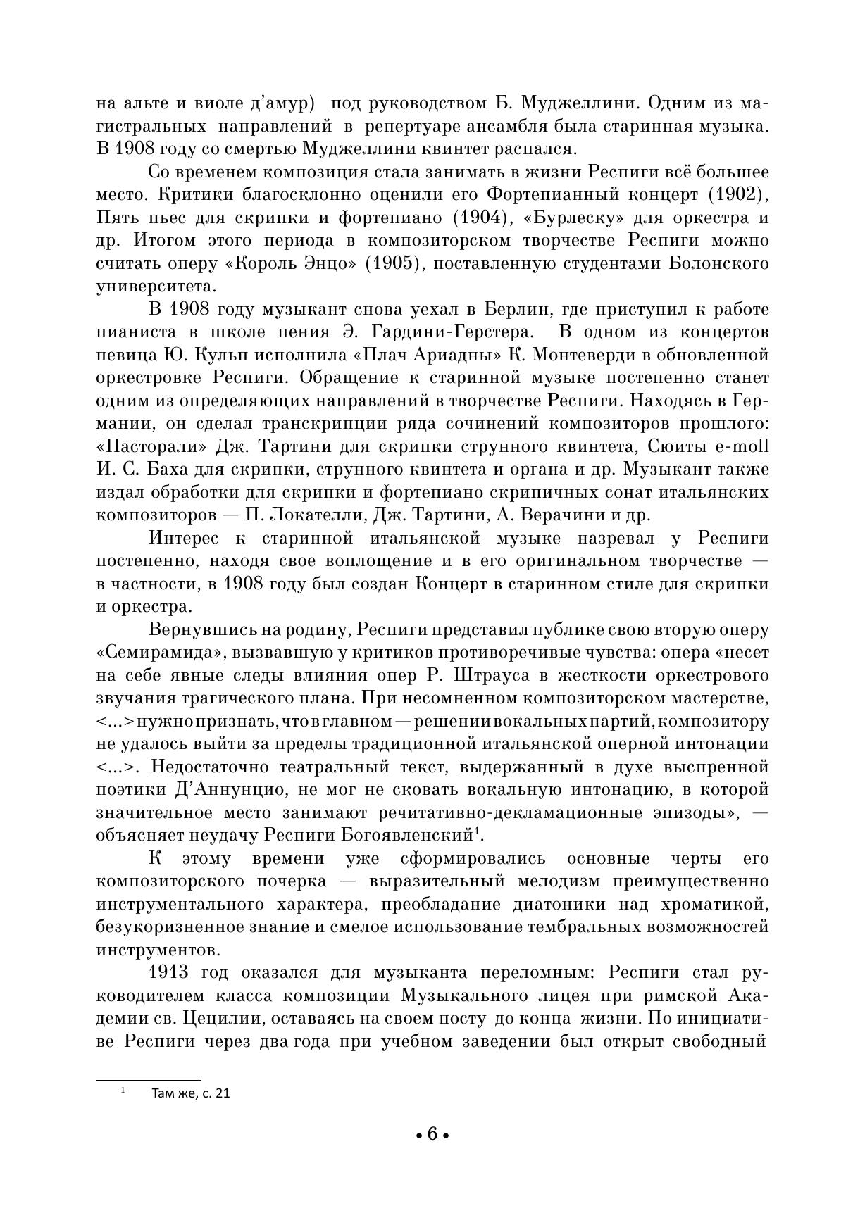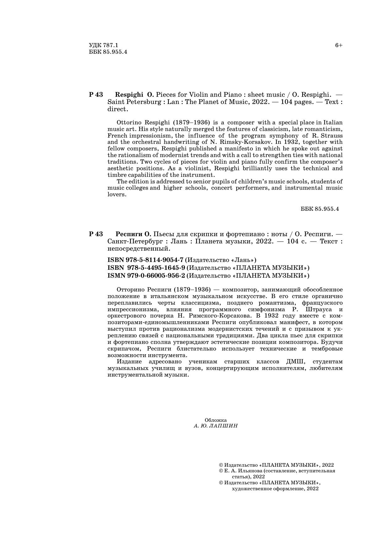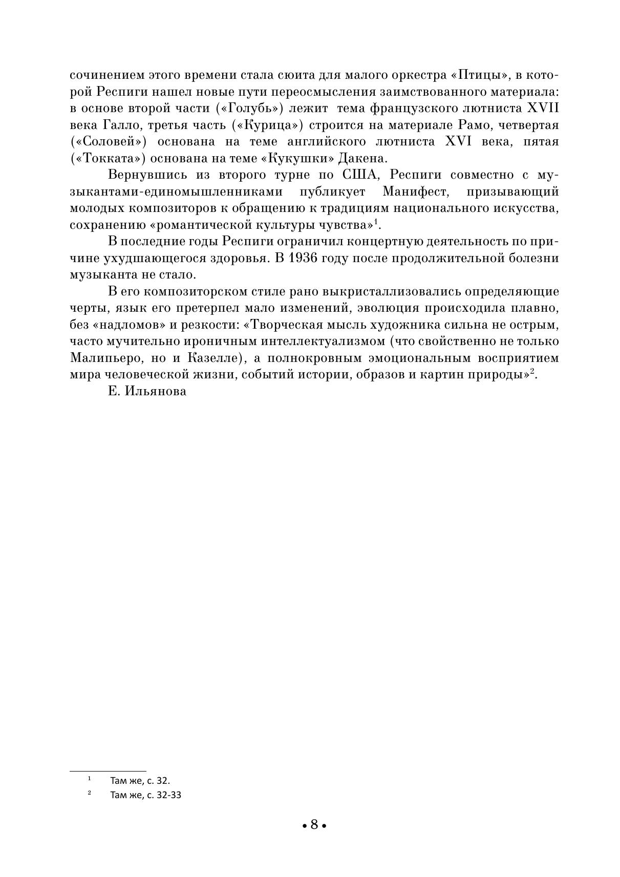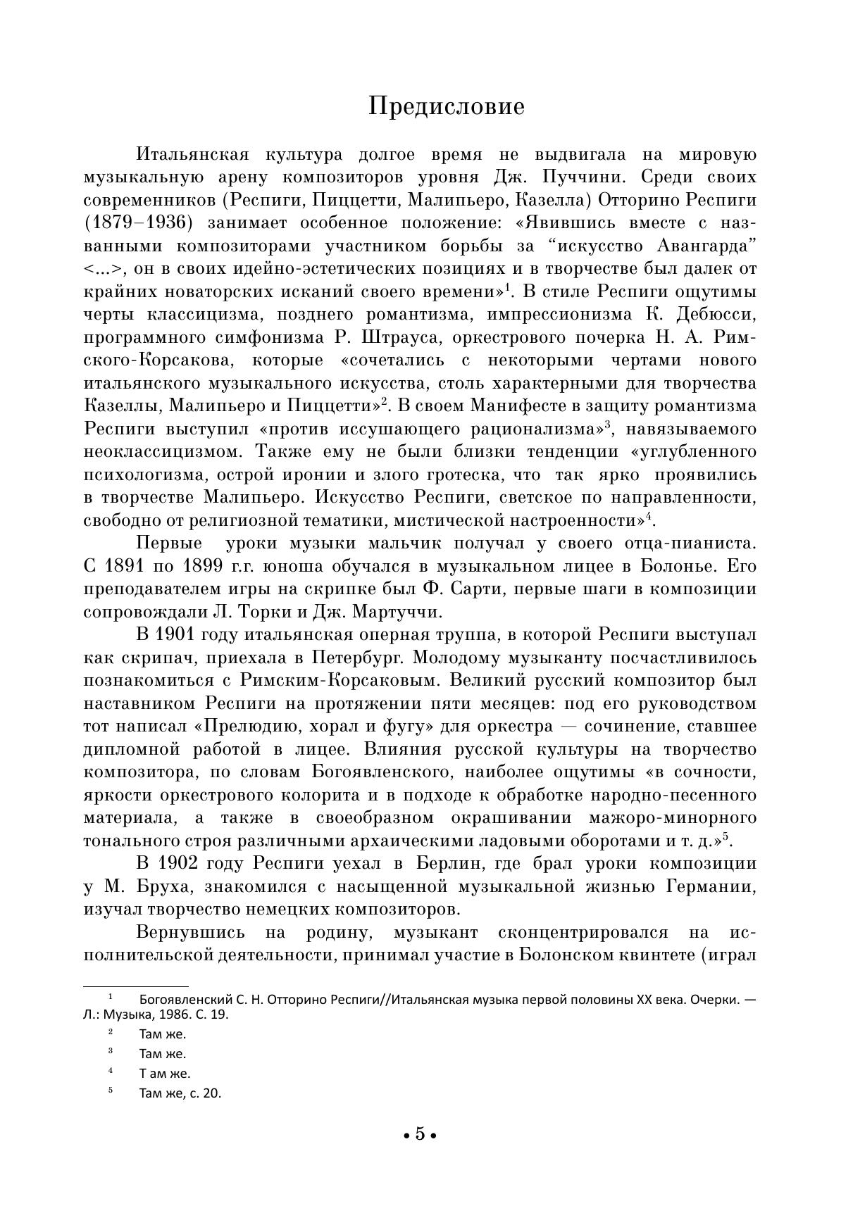 Отторино Респиги (1879-1936) — композитор, занимающий обособленное положение в итальянском музыкальном искусстве. В его стиле органично переплавились черты классицизма, позднего романтизма, французского импрессионизма, влияния программного симфонизма Р. Штрауса и оркестрового почерка Н. Римского-Корсакова. В 1932 году вместе с композиторами-единомышленниками Респиги опубликовал манифест, в котором выступил против рационализма модернистских течений и с призывом к укреплению связей с национальными традициями. Два цикла пьес для скрипки и фортепиано сполна утверждают эстетические позиции композитора. Будучи скрипачом, Респиги блистательно использует технические и тембровые возможности инструмента.