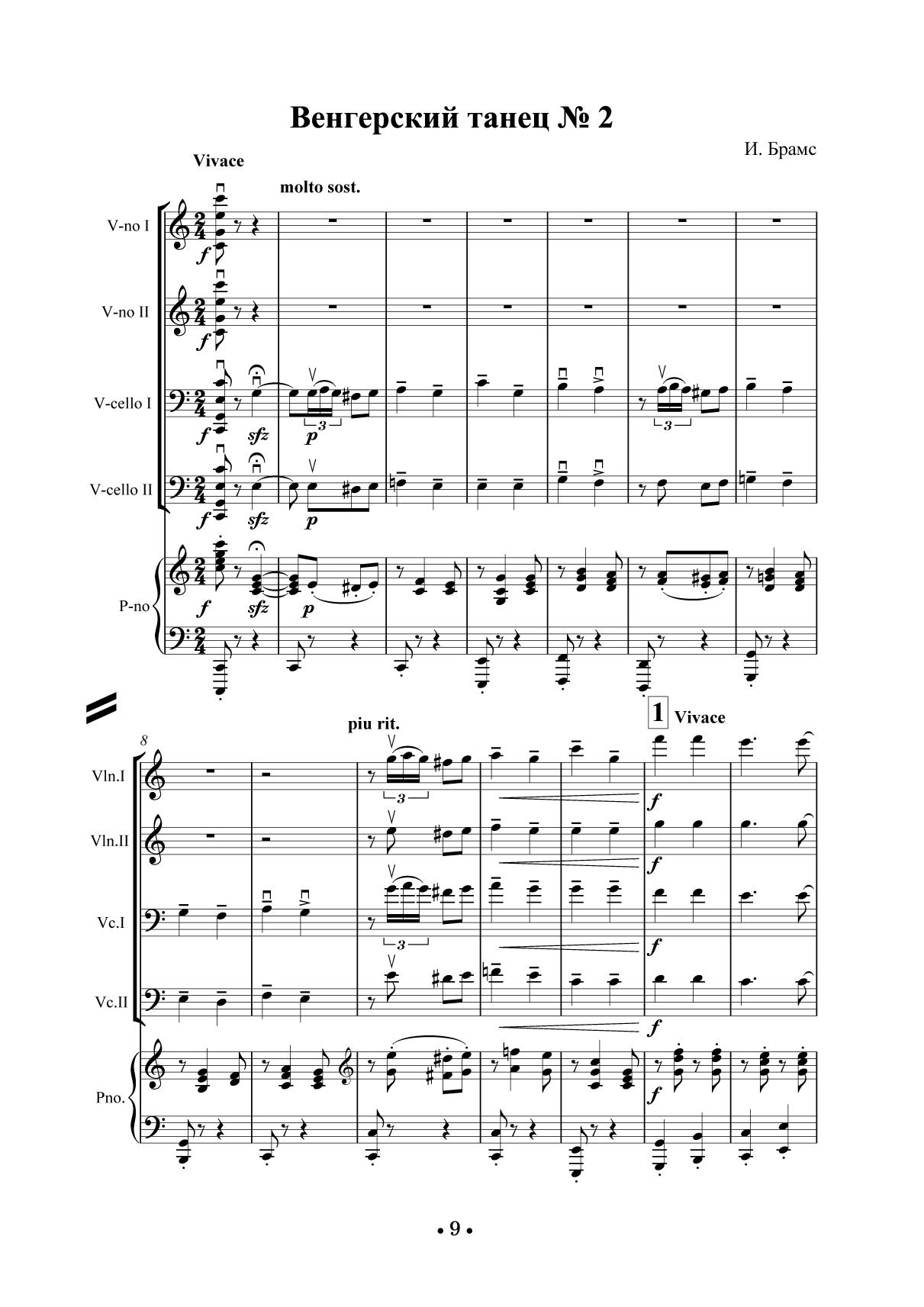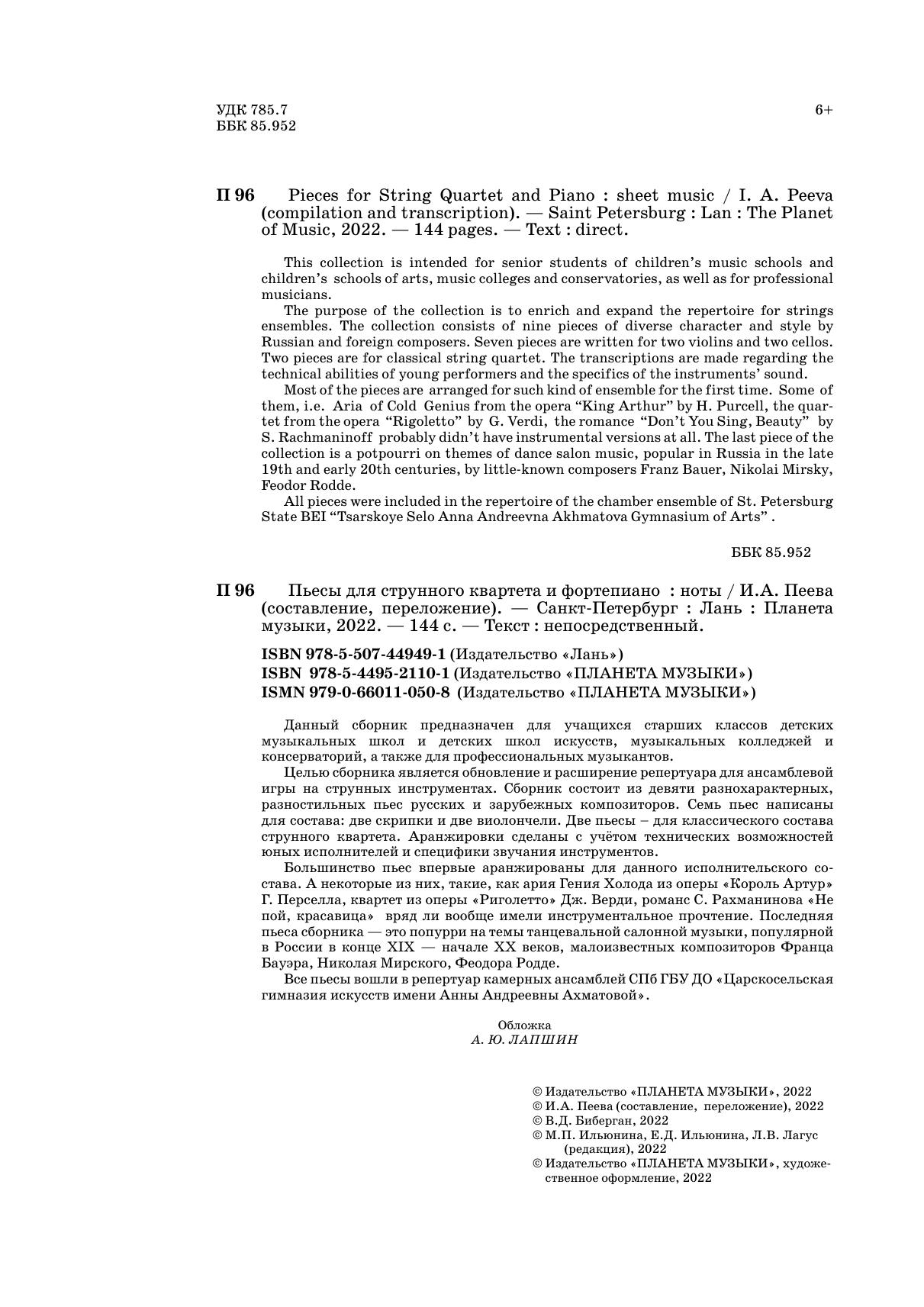 The purpose of the collection is to enrich and expand the repertoire for strings ensembles. The collection consists of nine pieces of diverse character and style by Russian and foreign composers. Seven pieces are written for two violins and two cellos. Two pieces are for classical string quartet. The transcriptions are made regarding the technical abilities of young performers and the specifics of the instruments’ sound.