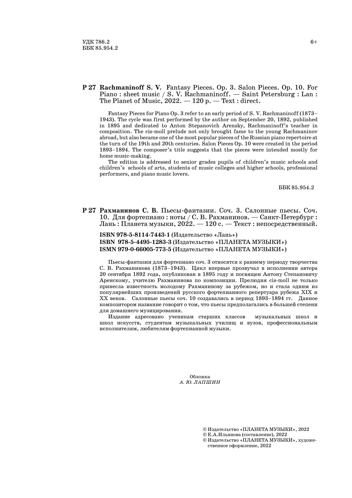 Fantasy Pieces for Piano Op. 3 refer to an early period of S. V. Rachmaninoff (1873–1943). The cycle was first performed by the author on September 20, 1892, published in 1895 and dedicated to Anton Stepanovich Arensky, Rachmaninoff’s teacher in composition. The cis-moll prelude not only brought fame to the young Rachmaninov abroad, but also became one of the most popular pieces of the Russian piano repertoire at the turn of the 19th and 20th centuries. Salon Pieces Op. 10 were created in the period 1893–1894. The composer’s title suggests that the pieces were intended mostly for home music-making.