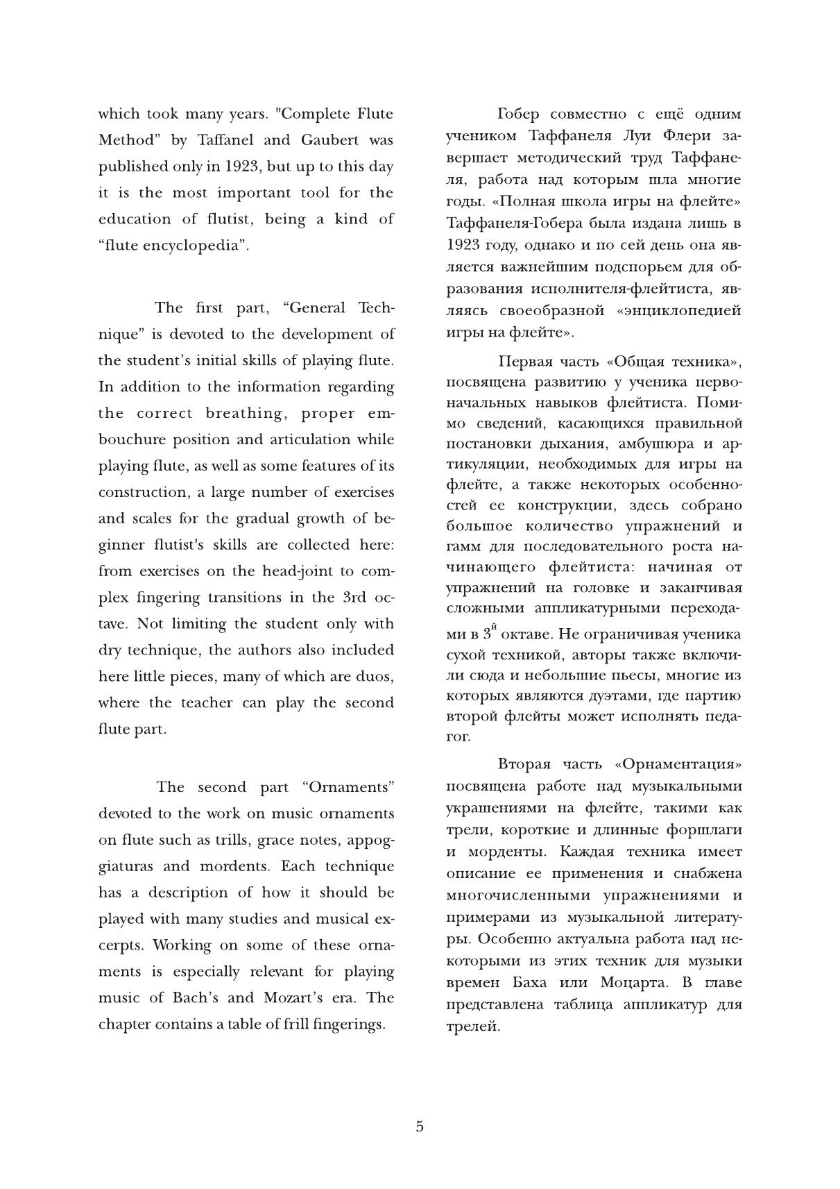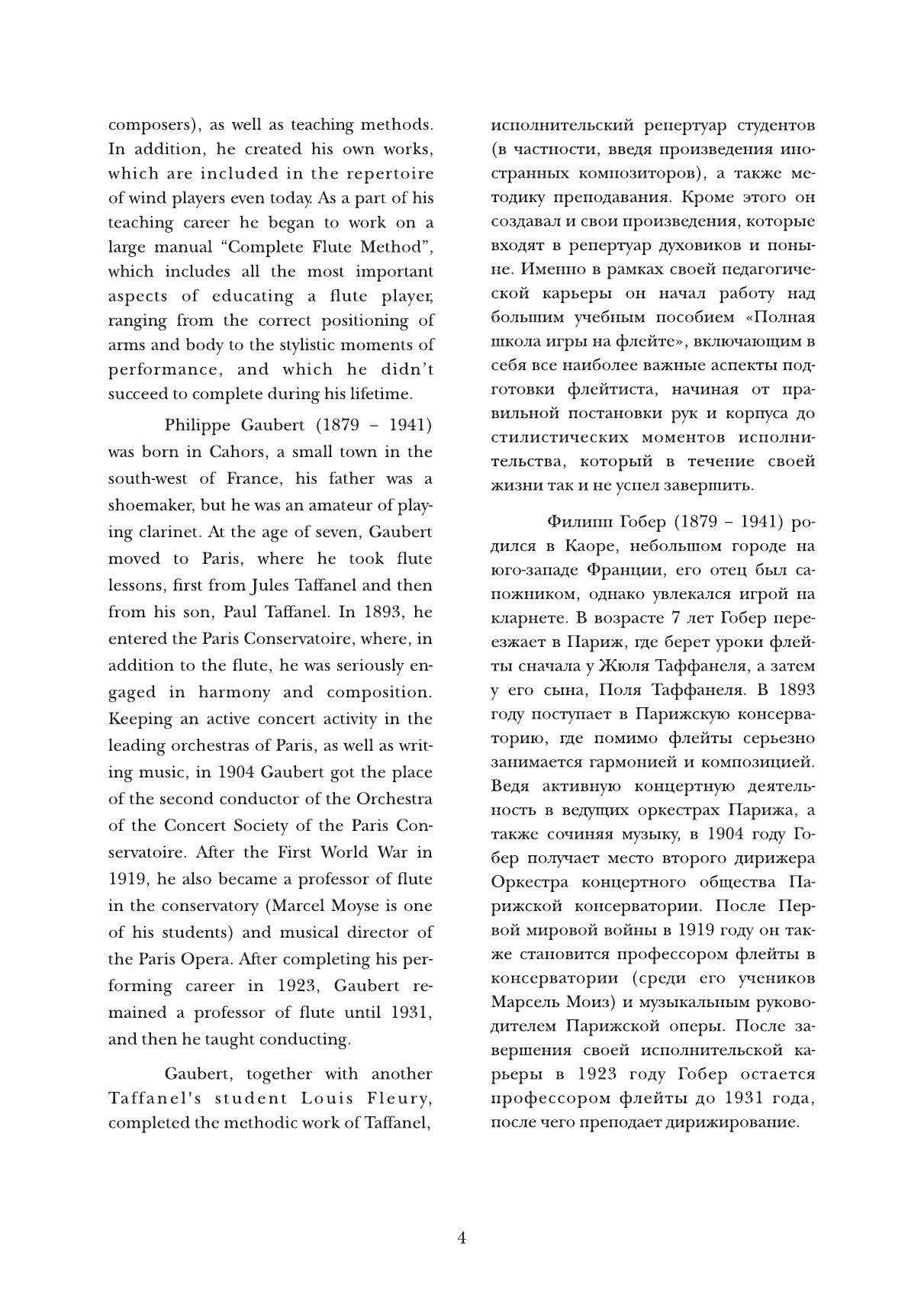 Поль Таффанель (1844–1908) — французский флейтист, композитор и педагог, воспитавший не одно поколение исполнителей. В соавторстве с учеником и последователем Филиппом Гобером (1879–1941) он создал учебное пособие «Полная школа игры на флейте», которое и по сей день является важнейшим подспорьем для образования исполнителя-флейтиста, являясь своеобразной «энциклопедией игры на флейте». Данное издание представляет полную версию этого труда и содержит восемь частей: «Общая техника», «Орнаментация», «Атака языка», «17 больших ежедневных упражнений для флейты», «24 прогрессивных этюда для флейты», «12 больших виртуозных этюдов для флейты», «О стиле» и «Оркестровые трудности». Издание адресовано флейтистам, учащимся и педагогам ДМШ, музыкальных училищ и вузов.