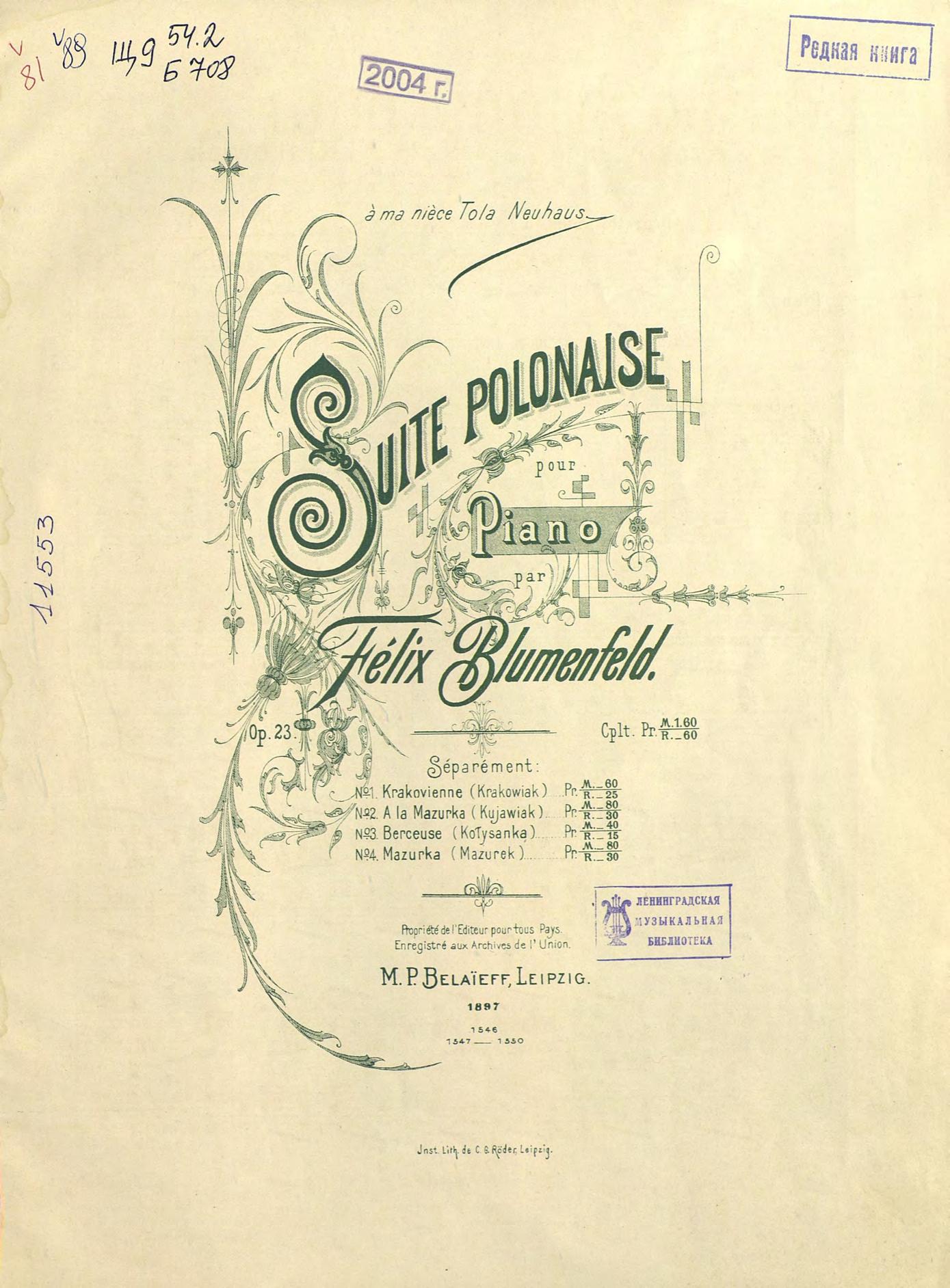 Перешедшие в общественное достояние материалы электронного фонда ЦГПБ им. В.В. Маяковского. Сведения о издательстве или типографии: изд. М. Беляева. Место издания: Лейпциг