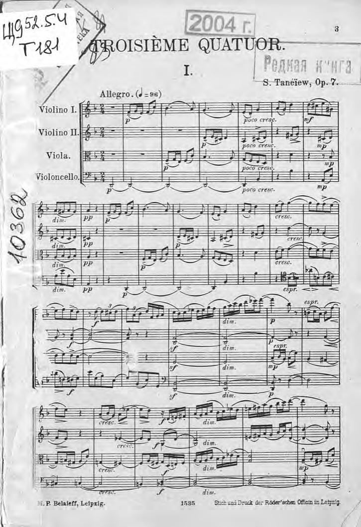 Quatuor (en re minor) pour 2 Violons, Alto et Violoncelle comp. par S. Taneiew