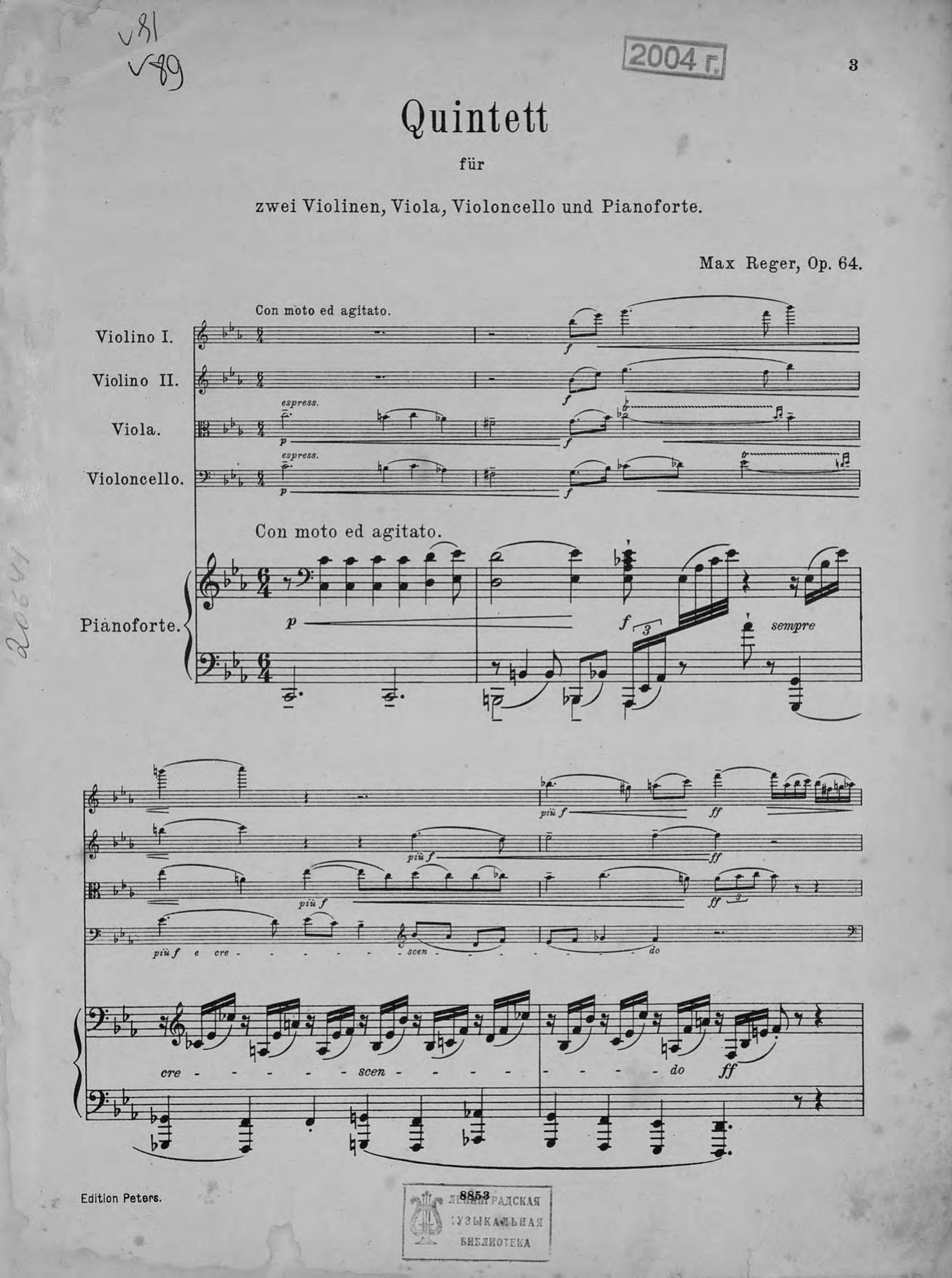 Quintett fur Pianoforte, 2 Violinen, Viola und Violoncell von Max Reger