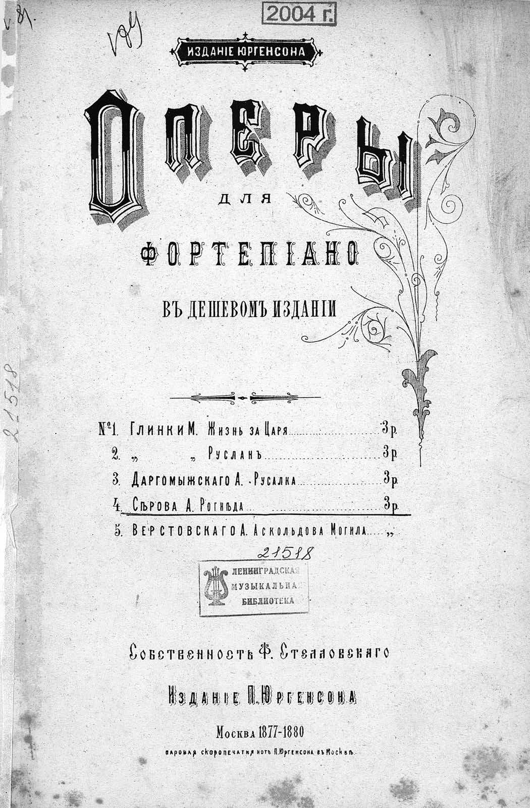 Перешедшие в общественное достояние материалы электронного фонда ЦГПБ им. В.В. Маяковского. Сведения о издательстве или типографии: П. Юргенсон. Место издания: Москва