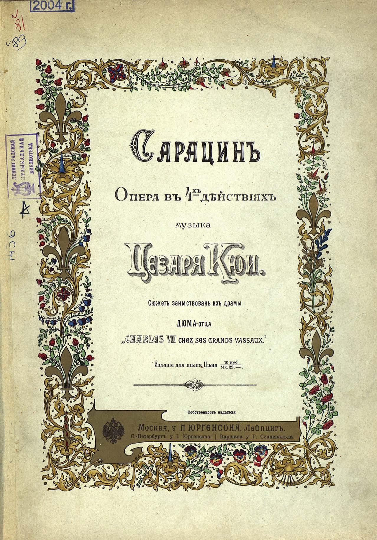 Перешедшие в общественное достояние материалы электронного фонда ЦГПБ им. В.В. Маяковского. Сведения о издательстве или типографии: П. Юргенсон. Место издания: Москва