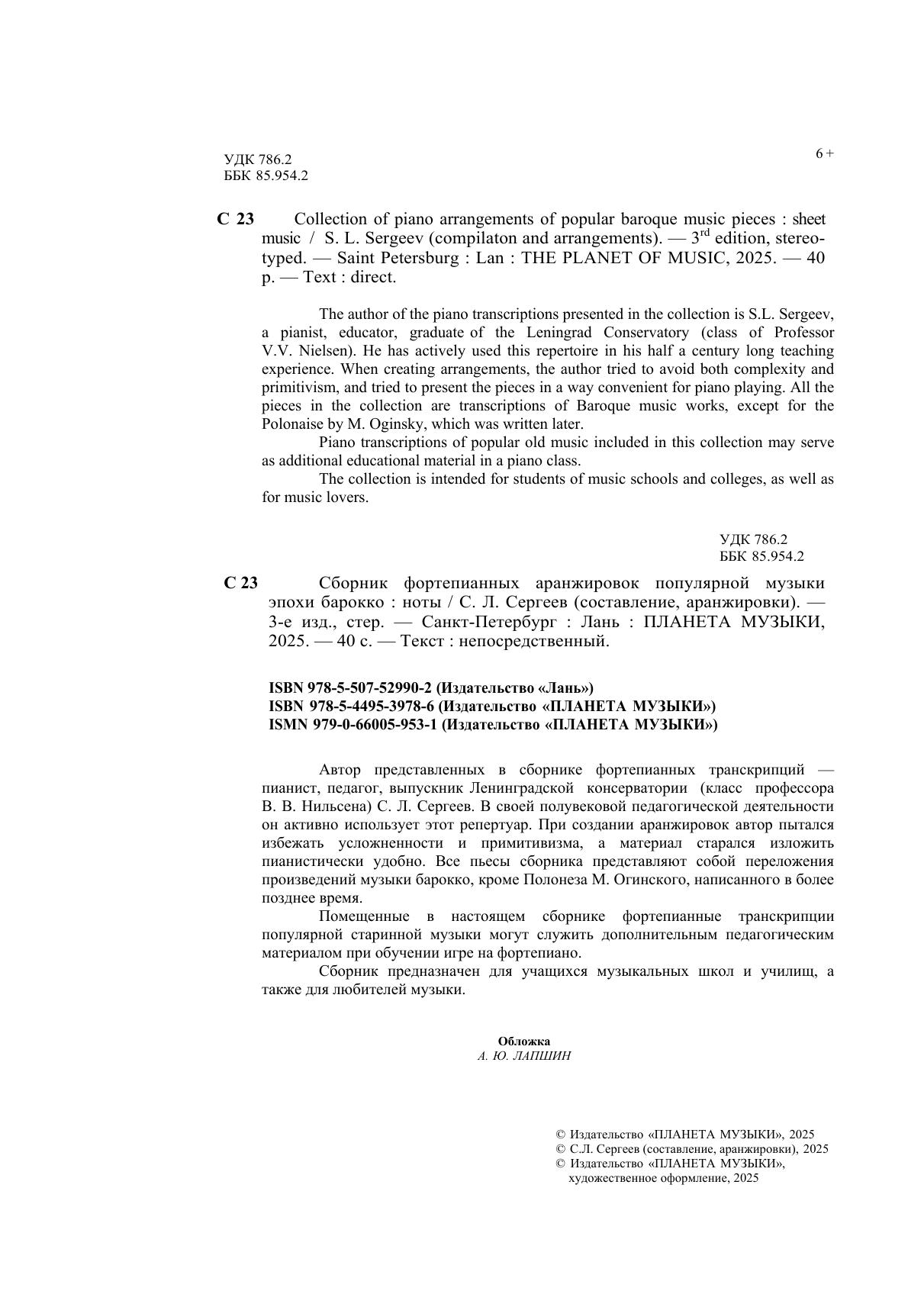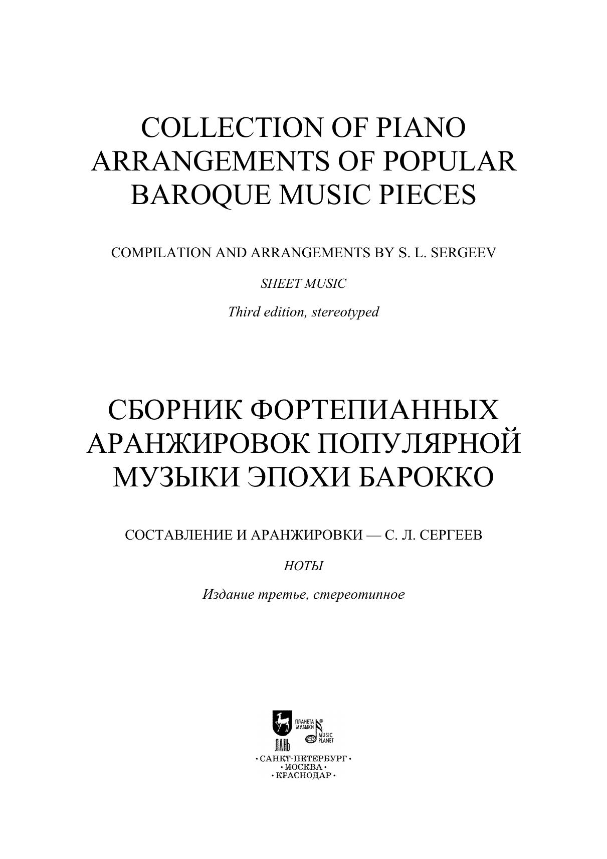 Автор представленных в сборнике фортепианных транскрипций — пианист, педагог, выпускник Ленинградской консерватории (класс профессора В. В. Нильсена) С. Л. Сергеев. В своей полувековой педагогической деятельности он активно использует этот репертуар. При создании аранжировок автор пытался избежать усложненности и примитивизма, а материал старался изложить пианистически удобно. Все пьесы сборника представляют собой переложения произведений музыки барокко, кроме Полонеза М. Огинского, написанного в более позднее время. Помещенные в настоящем сборнике фортепианные транскрипции популярной старинной музыки могут служить дополнительным педагогическим материалом при обучении игре на фортепиано. Сборник предназначен для учащихся музыкальных школ и училищ, а также для любителей музыки. The author of the piano transcriptions presented in the collection is S.L. Sergeev, a pianist, teacher, graduate of the Leningrad Conservatory (class of Professor V.V. Nielsen). He has actively used this repertoire in his half a century long teaching experience. When creating arrangements, the author tried to avoid both complexity and primitivism, and tried to present the pieces in a way convenient for piano playing. All the pieces in the collection are transcriptions of Baroque music works, except for the Polonaise by M. Oginsky, which was written later. Piano transcriptions of popular old music included in this collection may serve as additional educational material in a piano class. The collection is intended for students of music schools and colleges, as well as for music lovers.