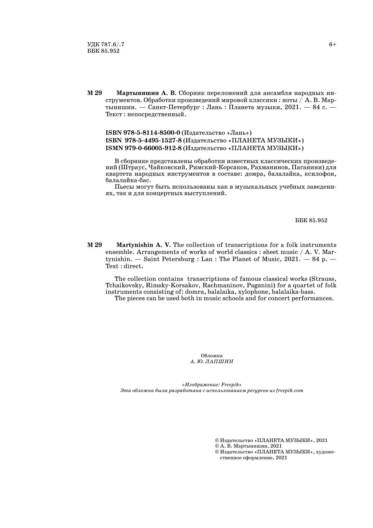 The collection contains transcriptions of famous classical works (Strauss, Tchaikovsky, Rimsky-Korsakov, Rachmaninov, Paganini) for a quartet of folk instruments consisting of: domra, balalaika, xylophone, balalaika-bass.