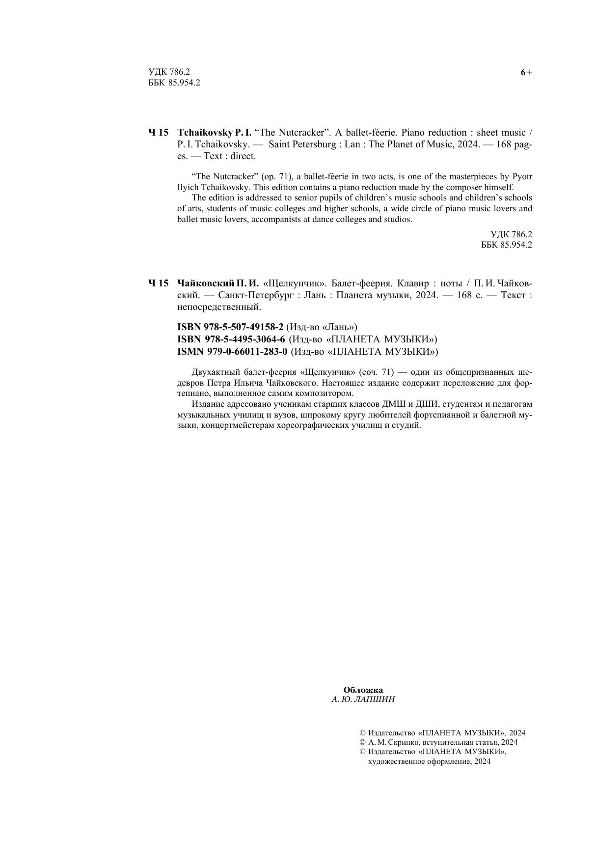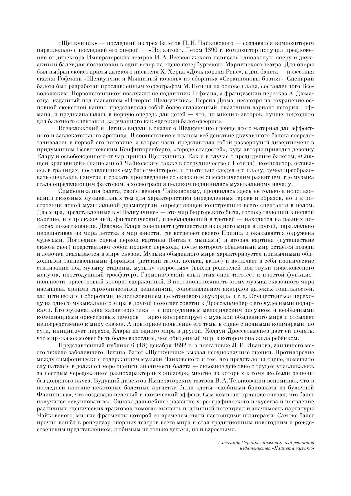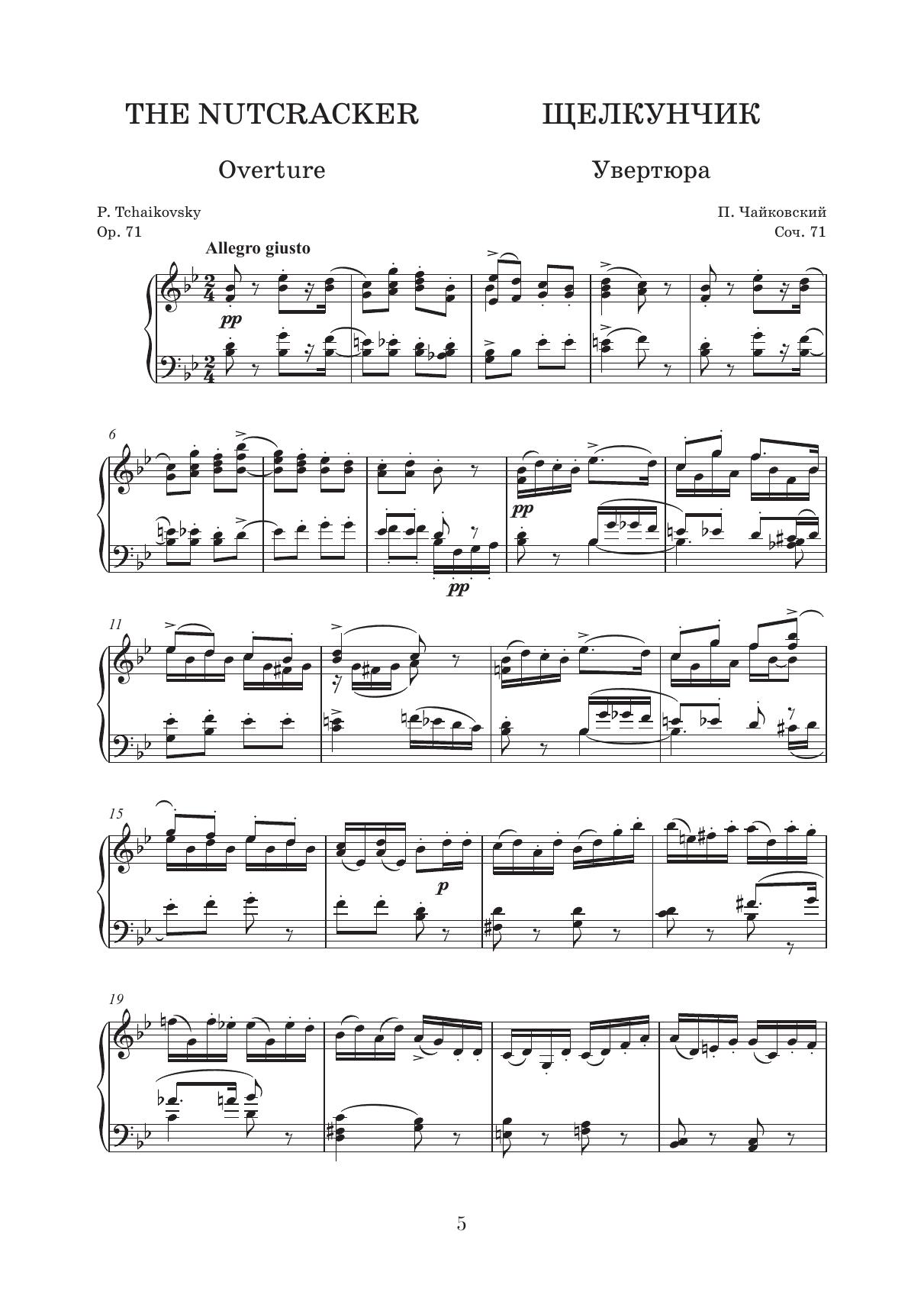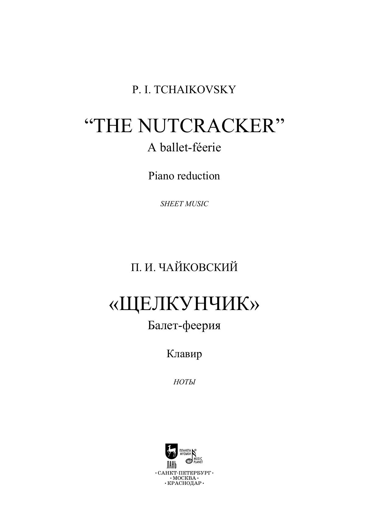 Двухактный балет-феерия «Щелкунчик» (соч. 71) — один из общепризнанных шедевров Петра Ильича Чайковского. Настоящее издание содержит переложение для фортепиано, выполненное самим композитором. Издание адресовано ученикам старших классов ДМШ и ДШИ, студентам и педагогам музыкальных училищ и вузов, широкому кругу любителей фортепианной и балетной музыки, концертмейстерам хореографических училищ и студий. “The Nutcracker” (op. 71), a ballet-féerie in two acts, is one of the masterpieces by Pyotr Ilyich Tchaikovsky. This edition contains a piano reduction made by the composer himself. The edition is addressed to senior pupils of children’s music schools and children’s schools of arts, students of music colleges and higher schools, a wide circle of piano music lovers and ballet music lovers, accompanists at dance colleges and studios.