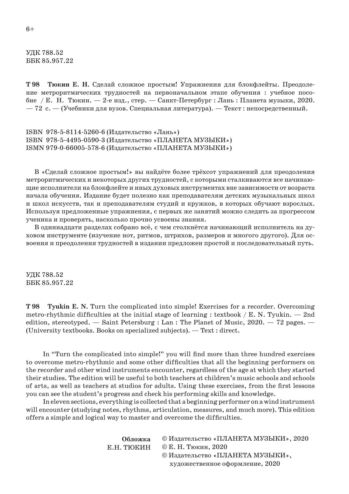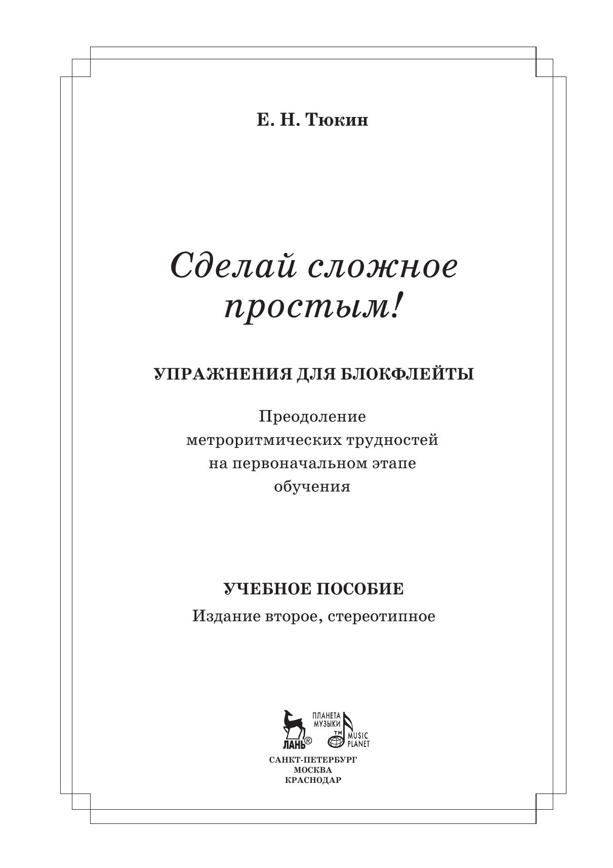 В «Сделай сложное простым!» вы найдёте более трёхсот упражнений для преодоления метроритмических и некоторых других трудностей, с которыми сталкиваются все начинающие исполнители на блокфлейте и иных духовых инструментах вне зависимости от возраста начала обучения. Издание будет полезно как преподавателям детских музыкальных школ и школ искусств, так и преподавателям студий и кружков, в которых обучают взрослых. Используя предложенные упражнения, с первых же занятий можно следить за прогрессом ученика и проверять, насколько прочно усвоены знания.