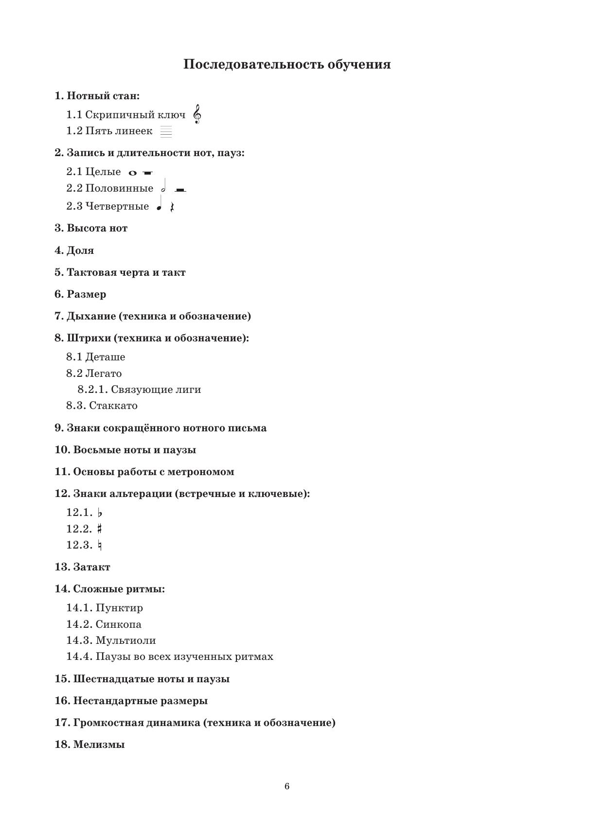 В одиннадцати разделах собрано всё, с чем столкнётся начинающий исполнитель на духовом инструменте (изучение нот, ритмов, штрихов, размеров и многого другого). Для освоения и преодоления трудностей в издании предложен простой и последовательный путь.