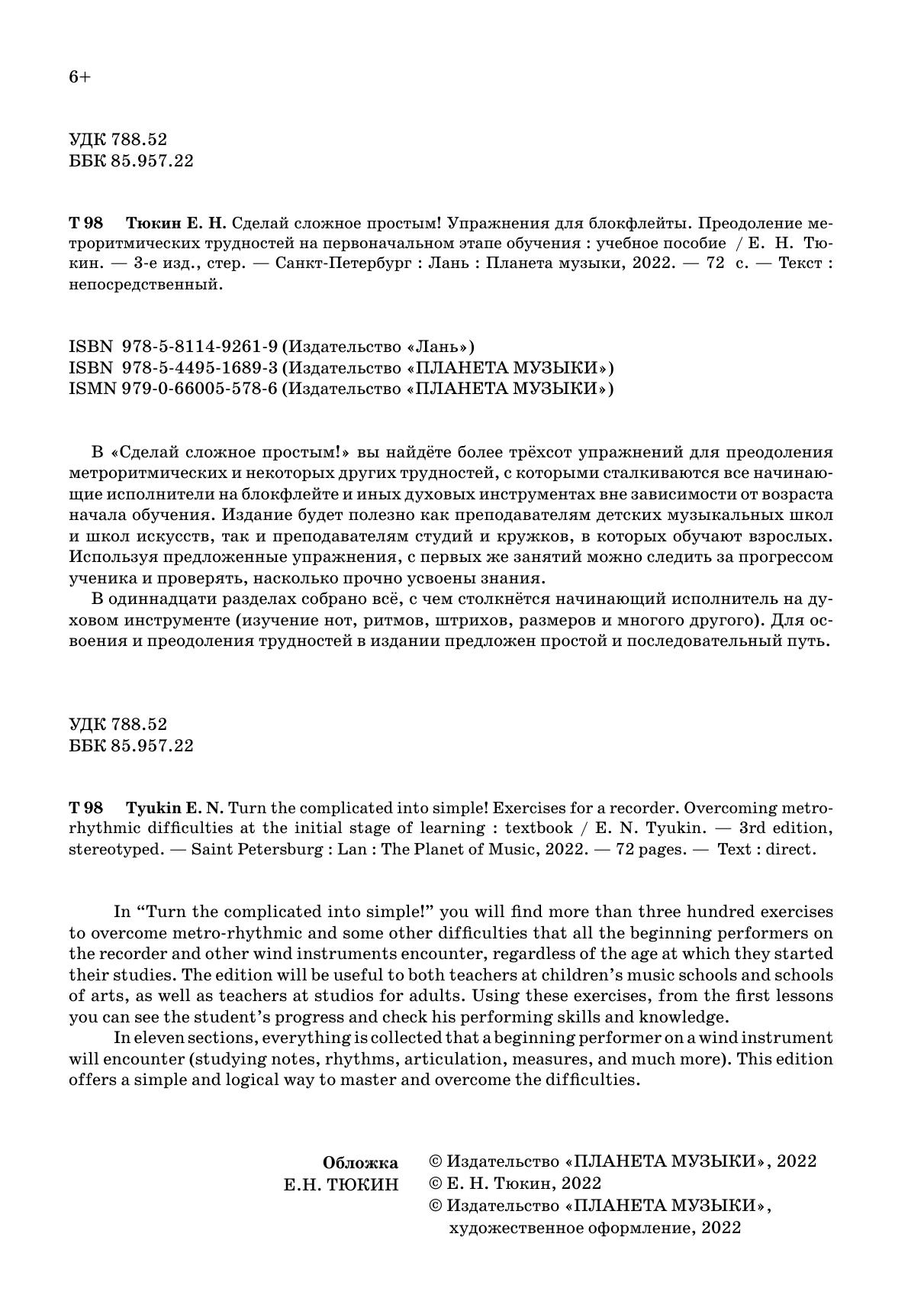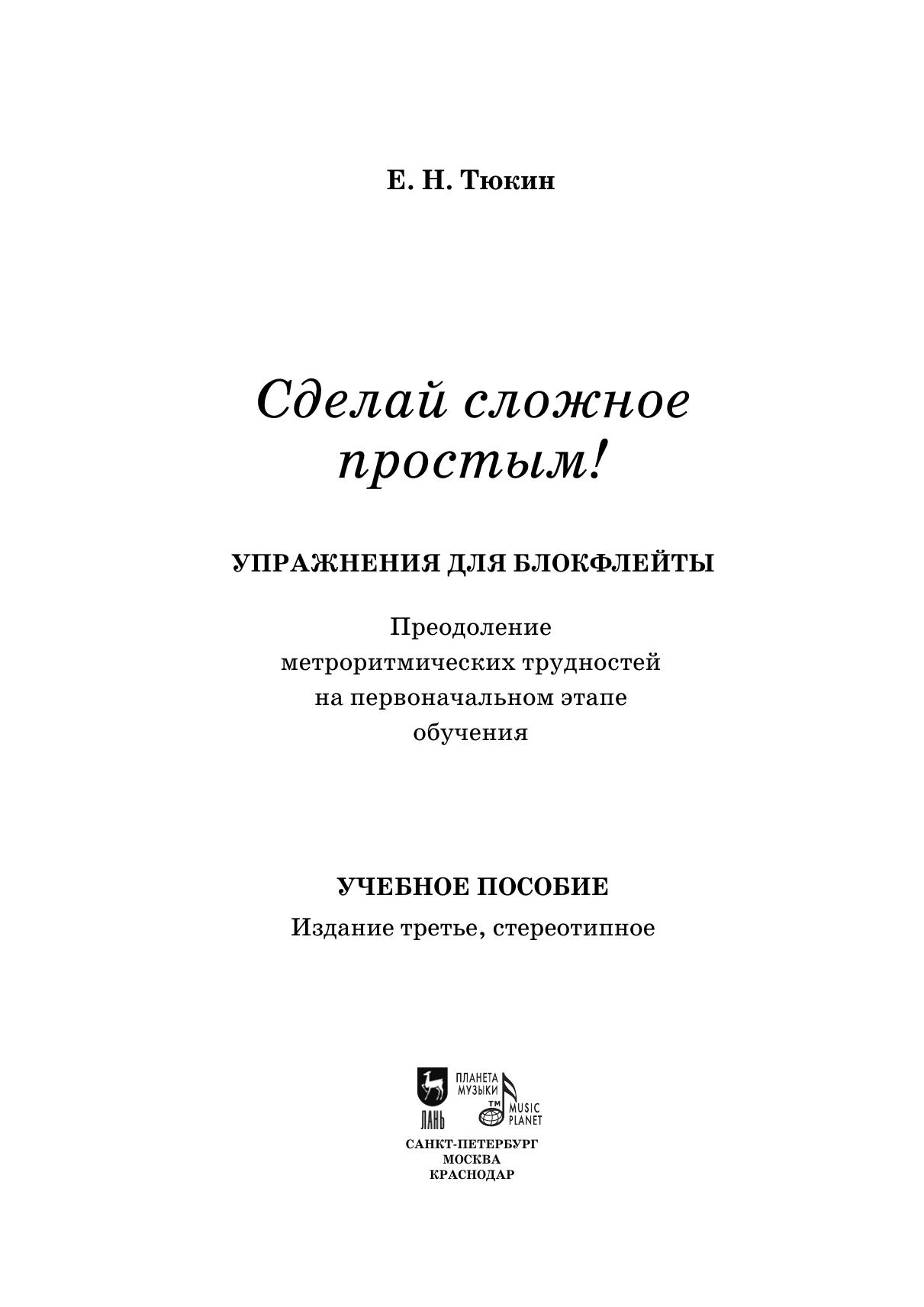 В «Сделай сложное простым!» вы найдёте более трёхсот упражнений для преодоления метроритмических и некоторых других трудностей, с которыми сталкиваются все начинающие исполнители на блокфлейте и иных духовых инструментах вне зависимости от возраста начала обучения. Издание будет полезно как преподавателям детских музыкальных школ и школ искусств, так и преподавателям студий и кружков, в которых обучают взрослых. Используя предложенные упражнения, с первых же занятий можно следить за прогрессом ученика и проверять, насколько прочно усвоены знания.