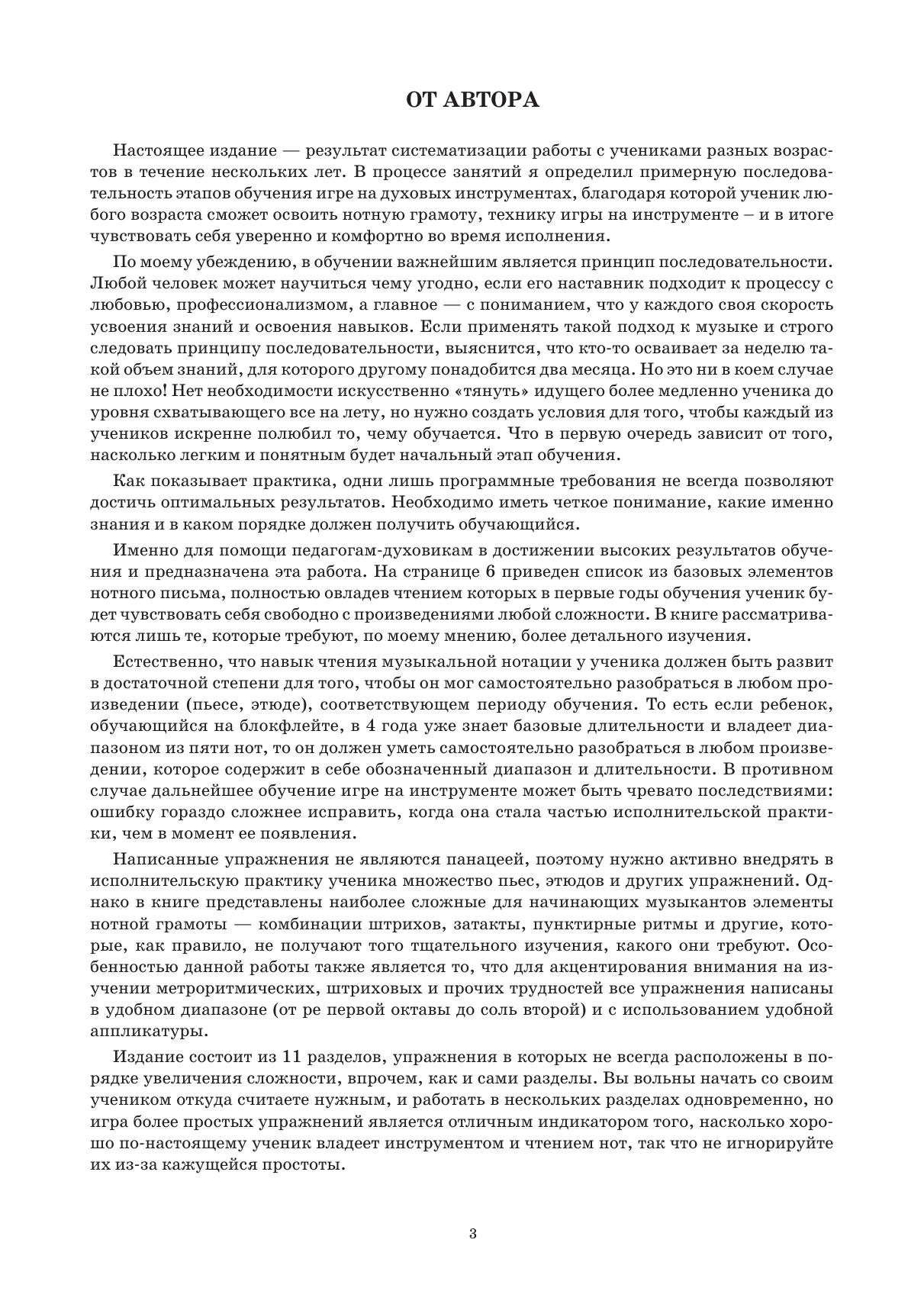 В одиннадцати разделах собрано всё, с чем столкнётся начинающий исполнитель на духовом инструменте (изучение нот, ритмов, штрихов, размеров и многого другого). Для освоения и преодоления трудностей в издании предложен простой и последовательный путь.