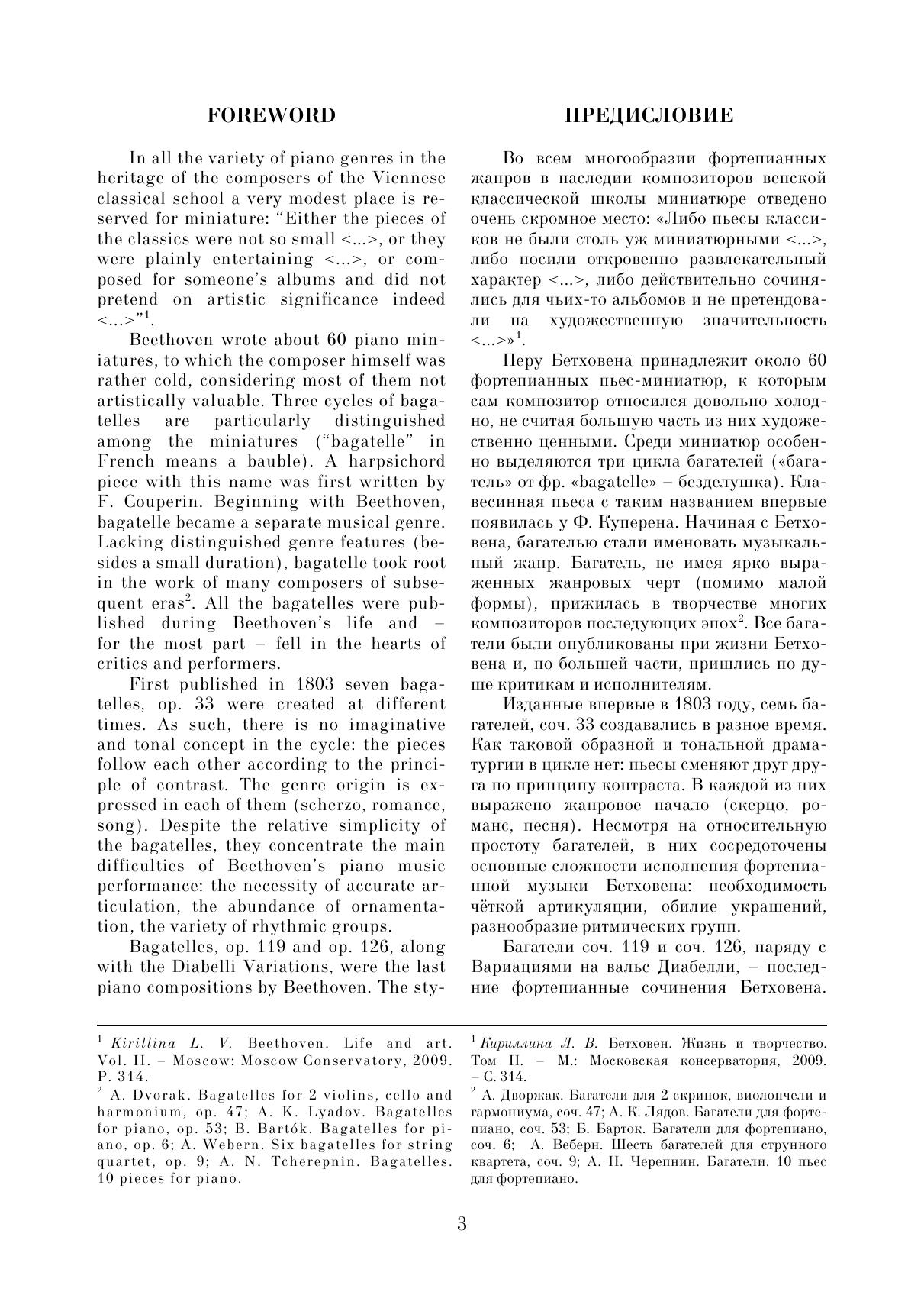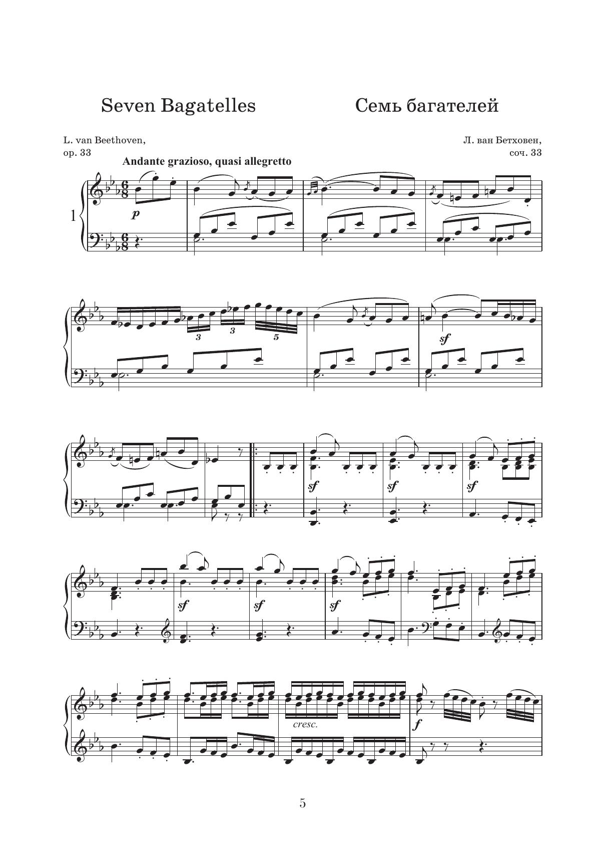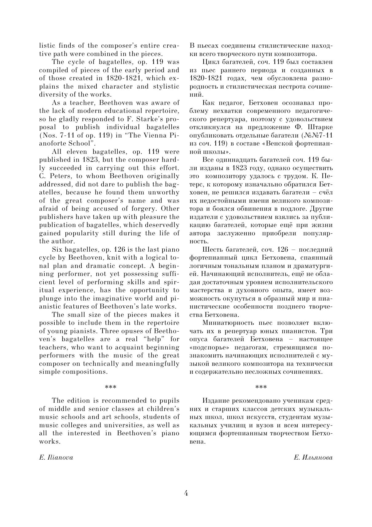 Три опуса багателей (ор. 33, ор. 119, ор. 126) создавались на протяжении длительного периода времени и отражают эволюцию фортепианного стиля композитора. Каждый цикл — это целая палитра образов, настроений, характеров.