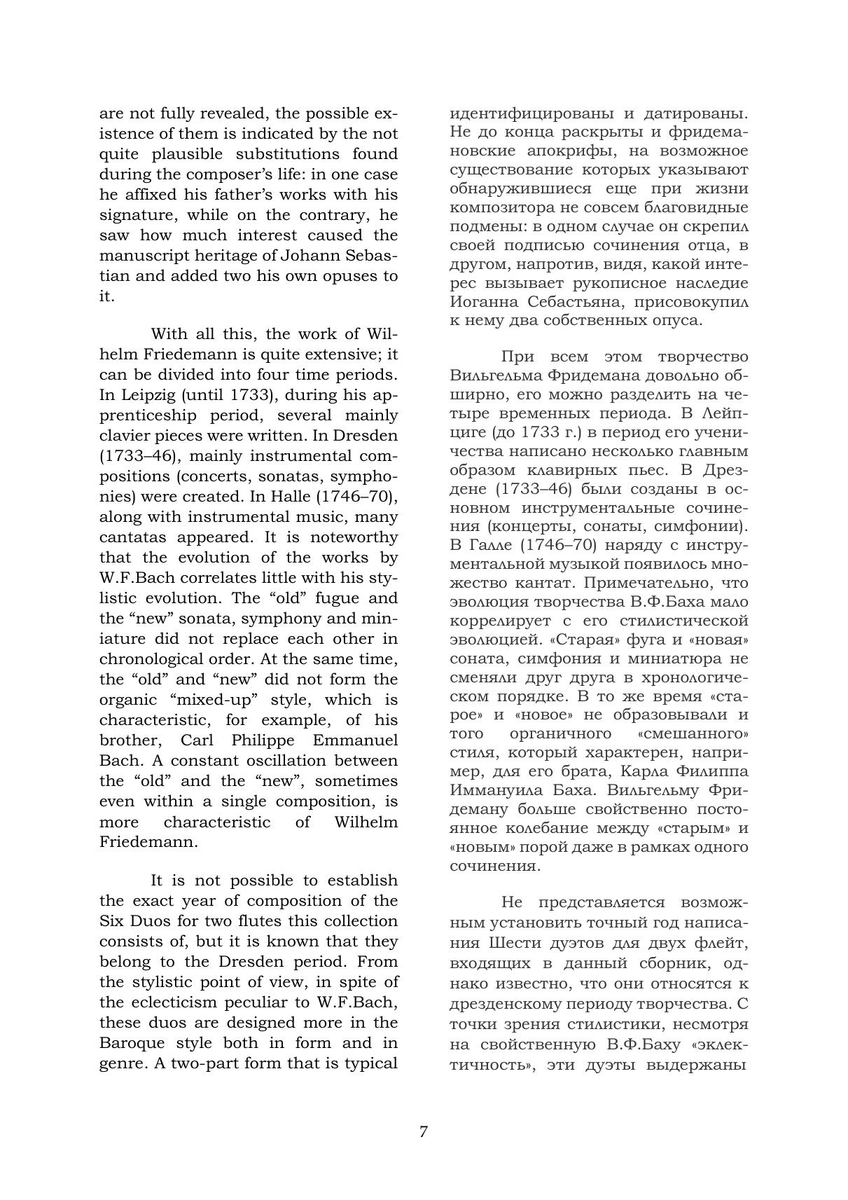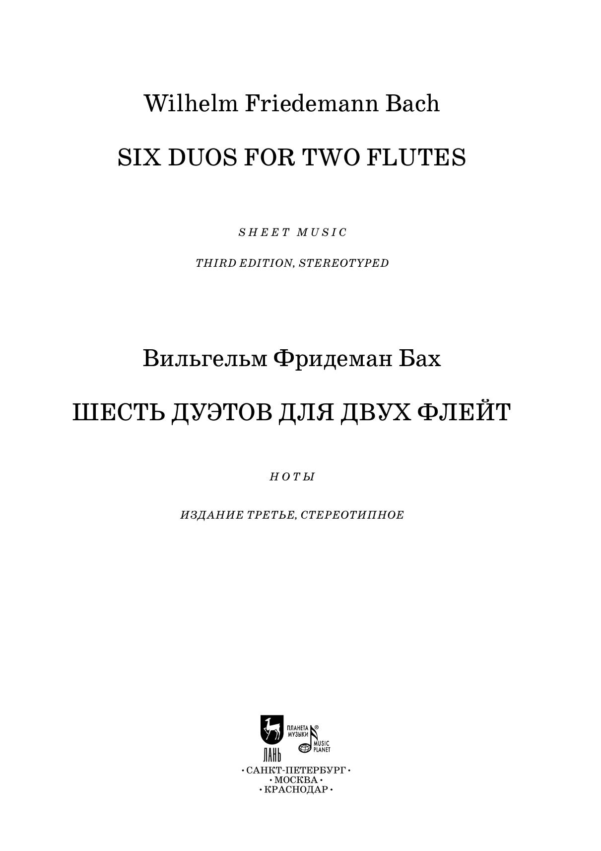 Six Duos for two flutes, presented in this collection, in form and genre are close to the Baroque style. Duos will be very useful for developing ensemble performance skills in a student. In the process of working on them, the performer will acquire a clarity of articulation, ease in the performing of various rhythmic figures and other skills.