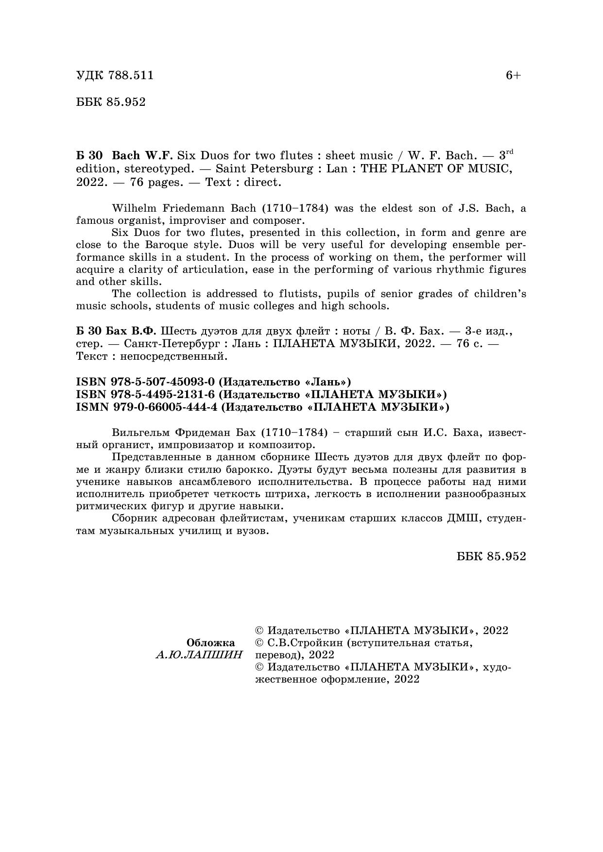 Представленные в данном сборнике Шесть дуэтов для двух флейт по форме и жанру близки стилю барокко. Дуэты будут весьма полезны для развития в ученике навыков ансамблевого исполнительства. В процессе работы над ними исполнитель приобретет четкость штриха, легкость в исполнении разнообразных ритмических фигур и другие навыки.