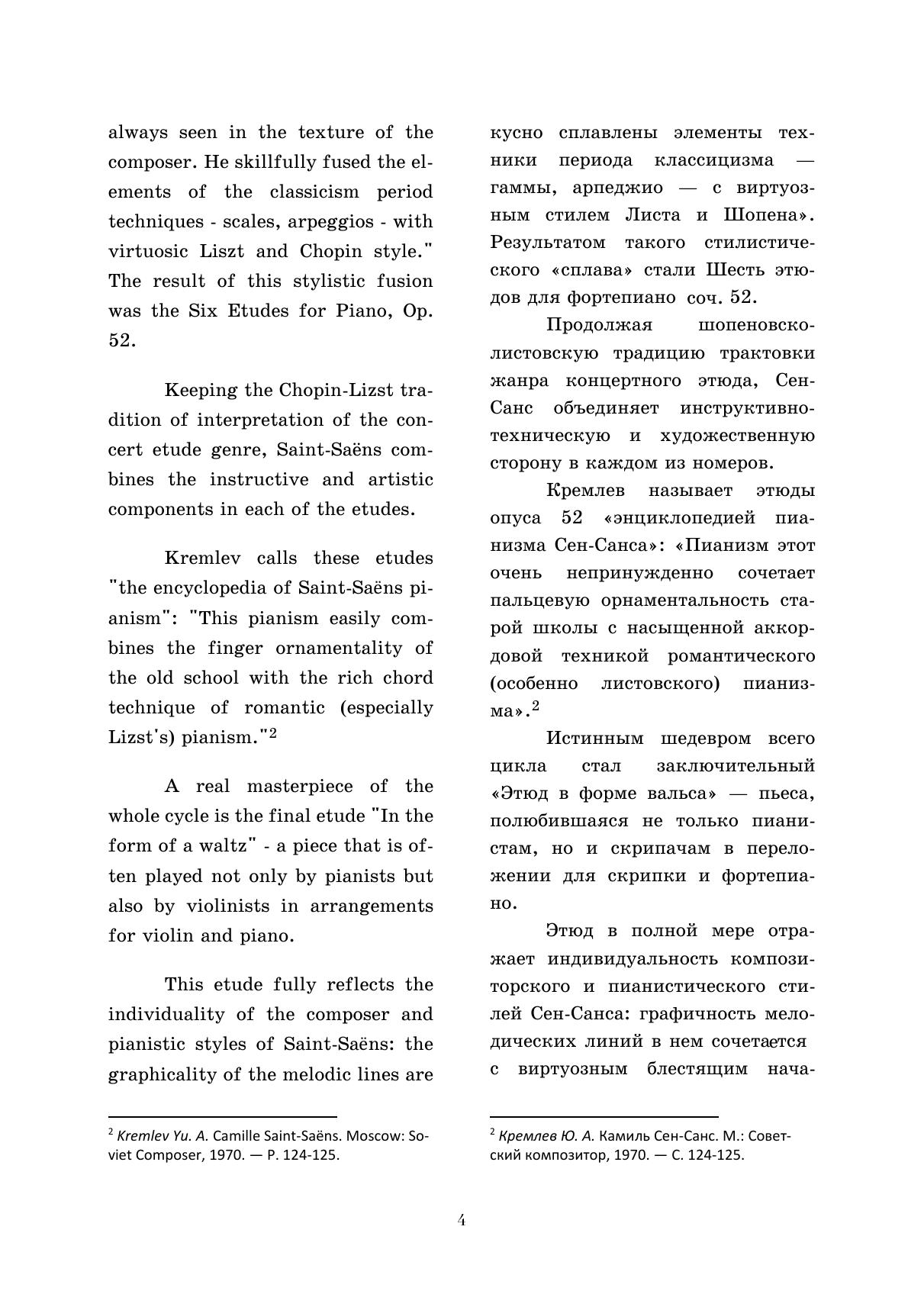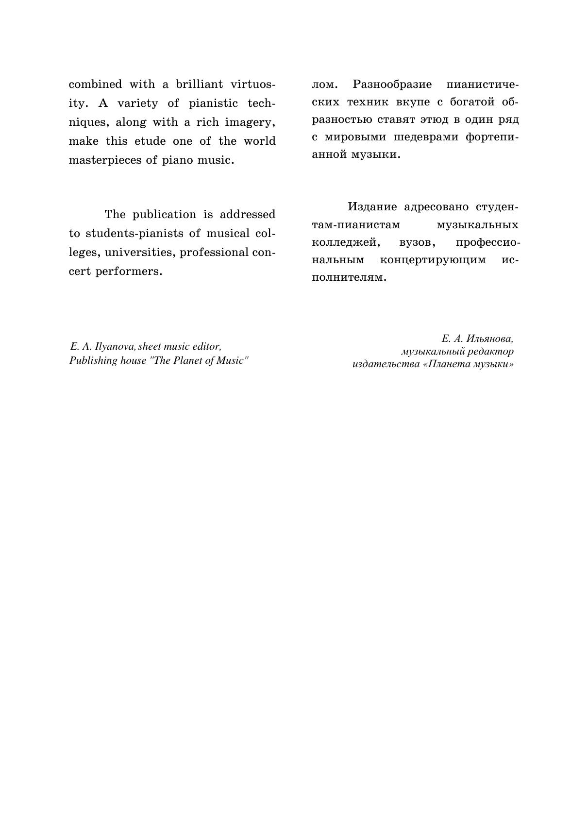 Наряду с композиторами-романтиками, Камиль Сен-Санс (1835-1921) не ограничивает жанр этюда инструктивно-техническими задачами, превращая его в полноценную концертную пьесу. Этюд в форме вальса — по сей день одно из самых любимых фортепианных сочинений французского композитора. Издание адресовано студентам музыкальных училищ, консерваторий, а также концертирующим исполнителям.